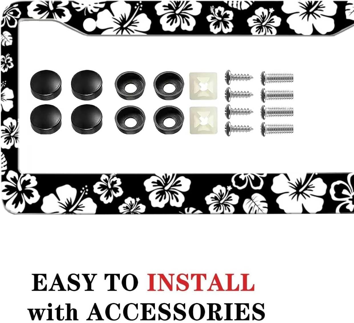 - DURABLE CONSTRUCTION: Made from premium quality metal with weather-resistant coating.Rain or Shine, Stay Secure β Our Rust-Proof Black and White Hibiscus Floral License Plate Frame Wonβt Budge at Any Speed!