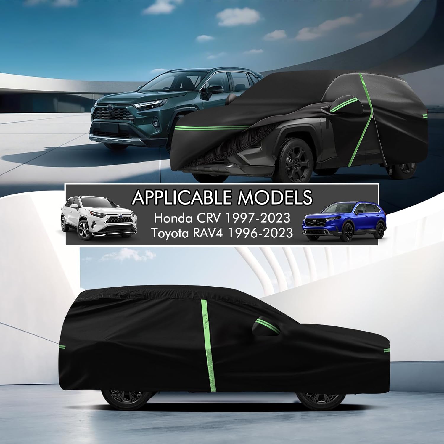 - ðãPremium MaterialãThe car cover for Honda CRV 1997-2025, Toyota RAV4 1996-2025 is made of heavy-duty 210D Oxford cloth and waterproof silver-plated fabric, and has multi-layer cotton coating, which can be windproof, dustproof, UV-proof, sun-proof, not easy to tear, and withstand water pressure up to 1600mm. The inner layer also has a thickened cotton backing, which not only fully prevents the paint from being scratched, but also has thermal insulation, which is warm in winter and cool in summer.