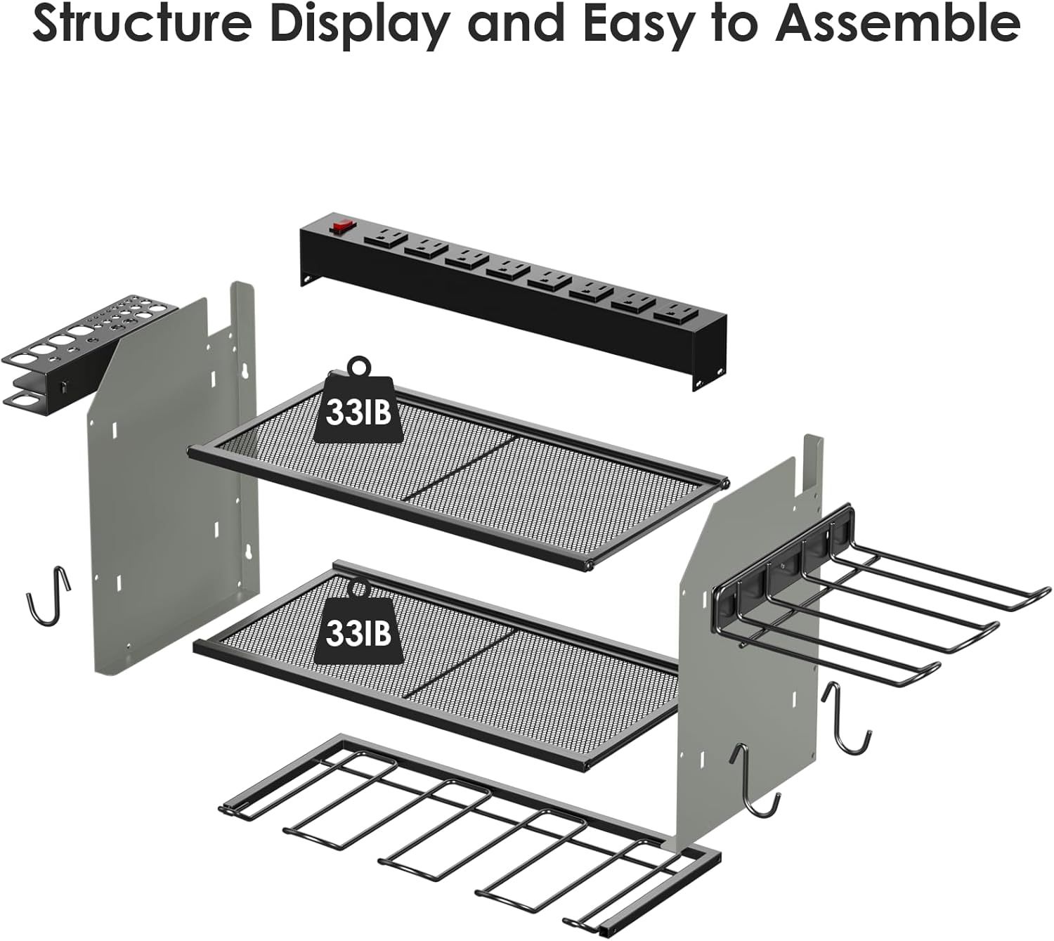 - Easy to assemble and mount on a peg board, If you need more storage space, you can connect the two shelves (or more) by screws. Each layer of the grid can support a maximum weight of 33IB. Made from heavy gauge steel.