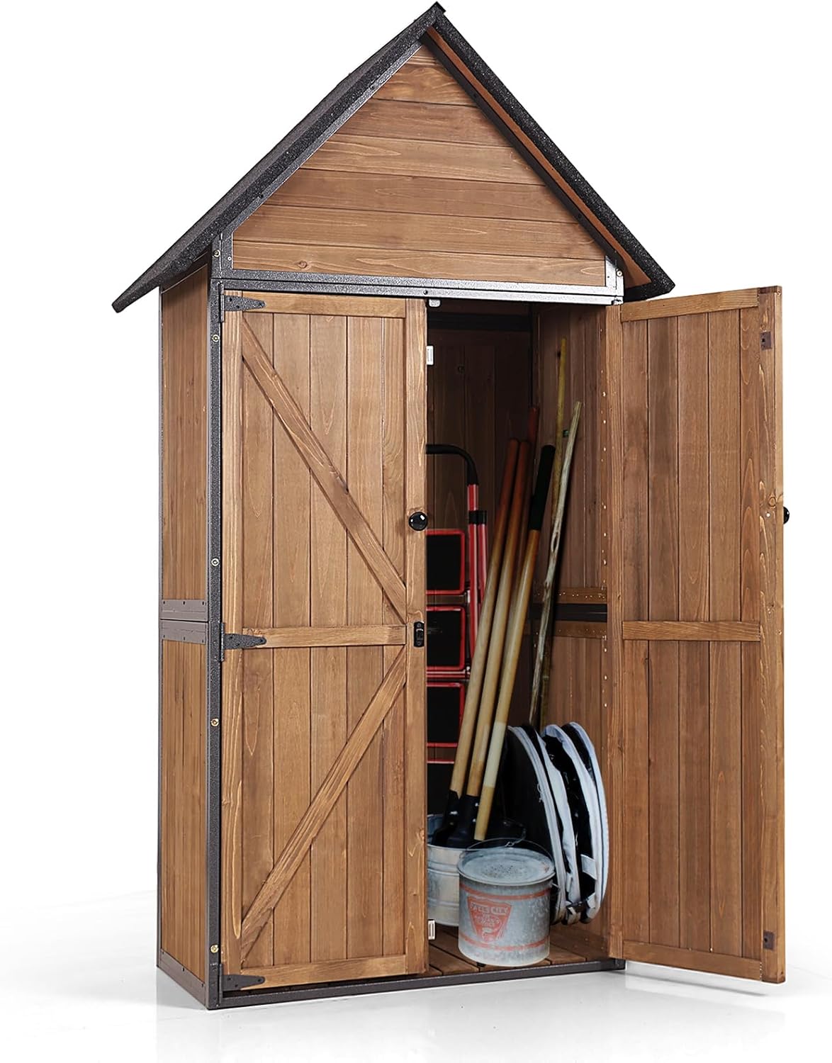 GUTINNEEN Sheds Outdoor Storage Wooden Garden Tool Shed with Metal Frame Sloped Roof and Adjustable 3 Tiers Shelves Outdoor Storage Cabinet for Backyard Garden Patio Lawn 67.1"(Brown)
