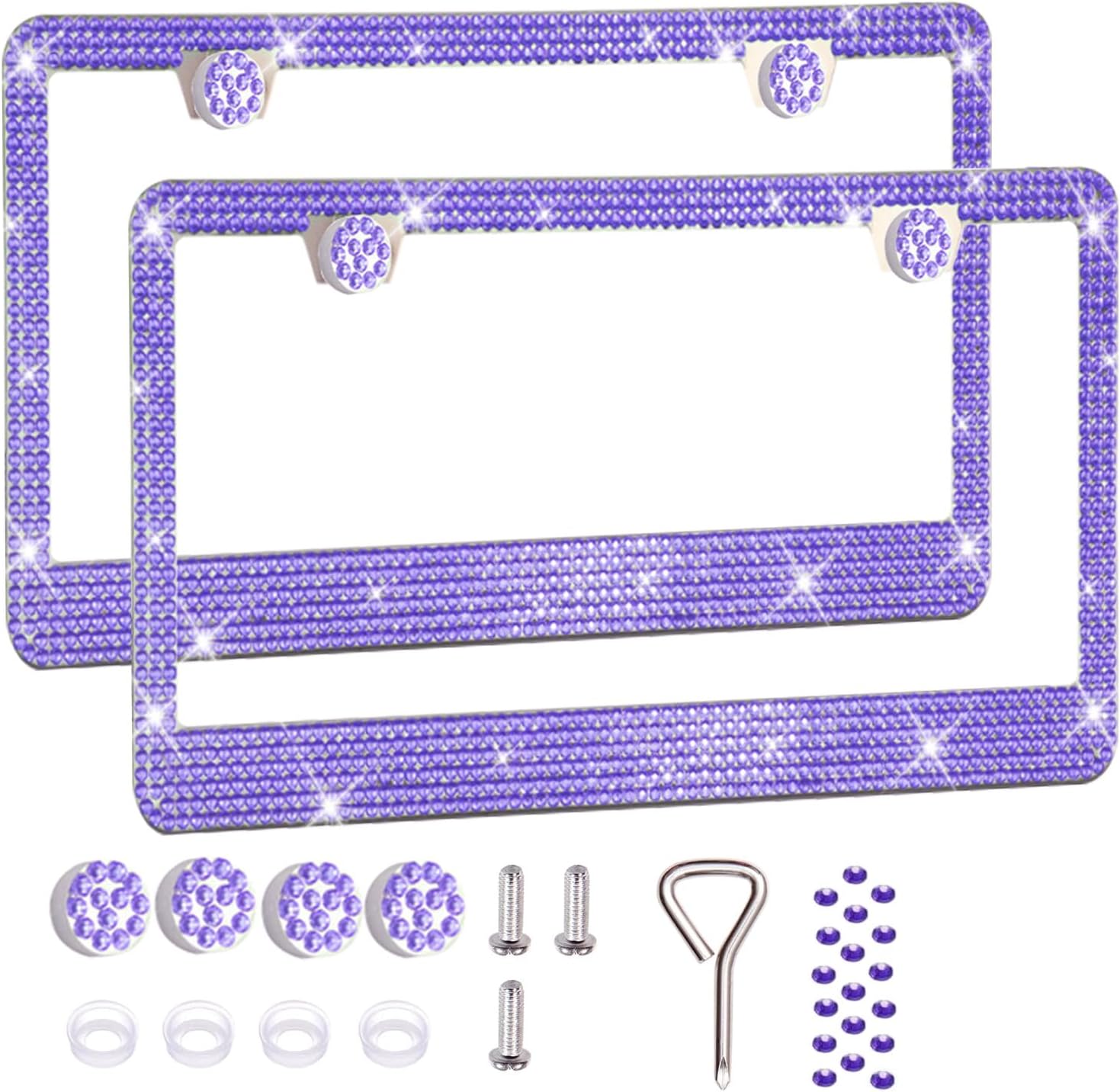 2 Pack License Plate Frames for Women, Sparkly Rhinestone Diamond Car Accessories with Glitter Crystal Caps (Purple (2PCS))
