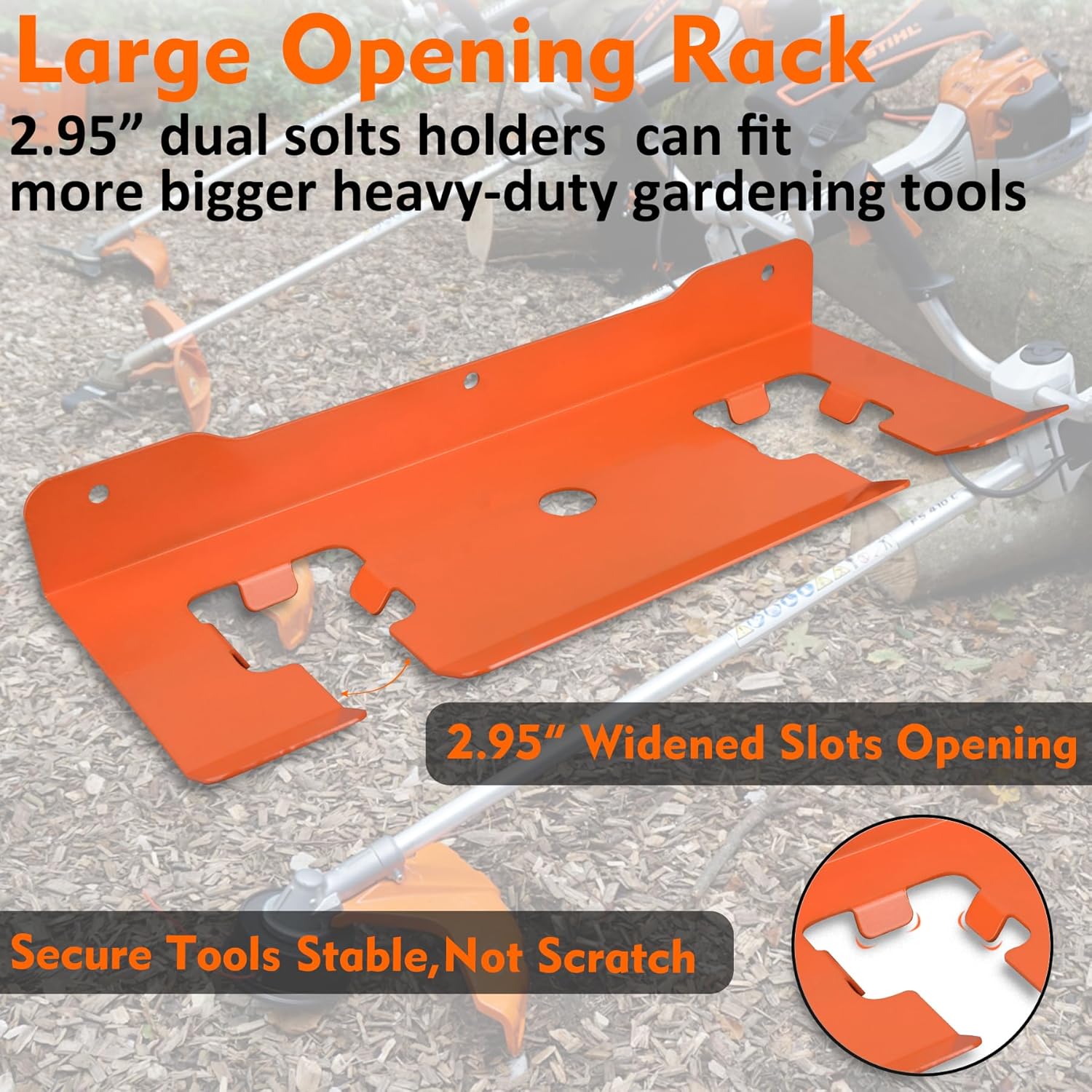 - Large Opening Weed Eater Rack: Smooth, flat panels with rounded edges prevent cuts and protect tools. The dual-slot design secures heavy items firmly, while rust-resistant, crack-proof materials ensure long-lasting durability