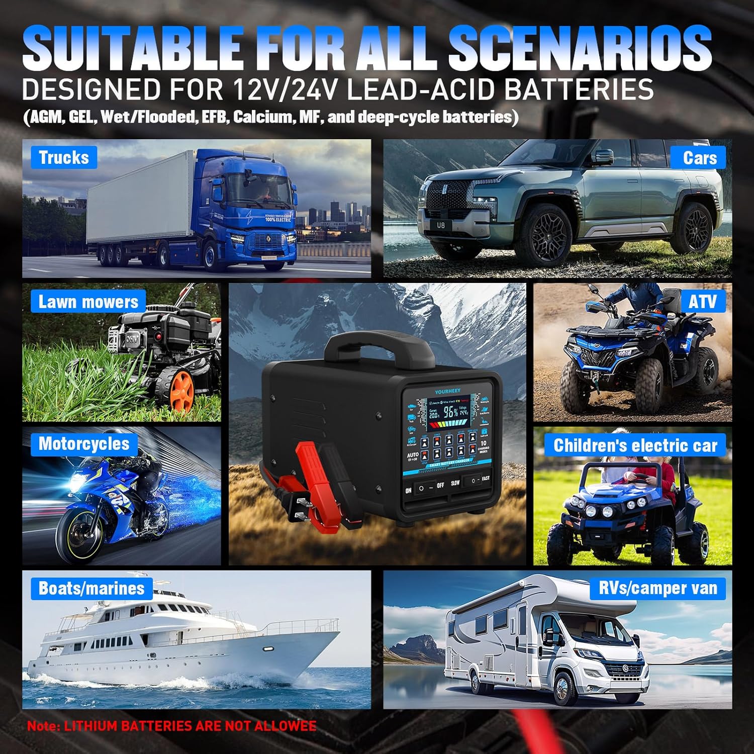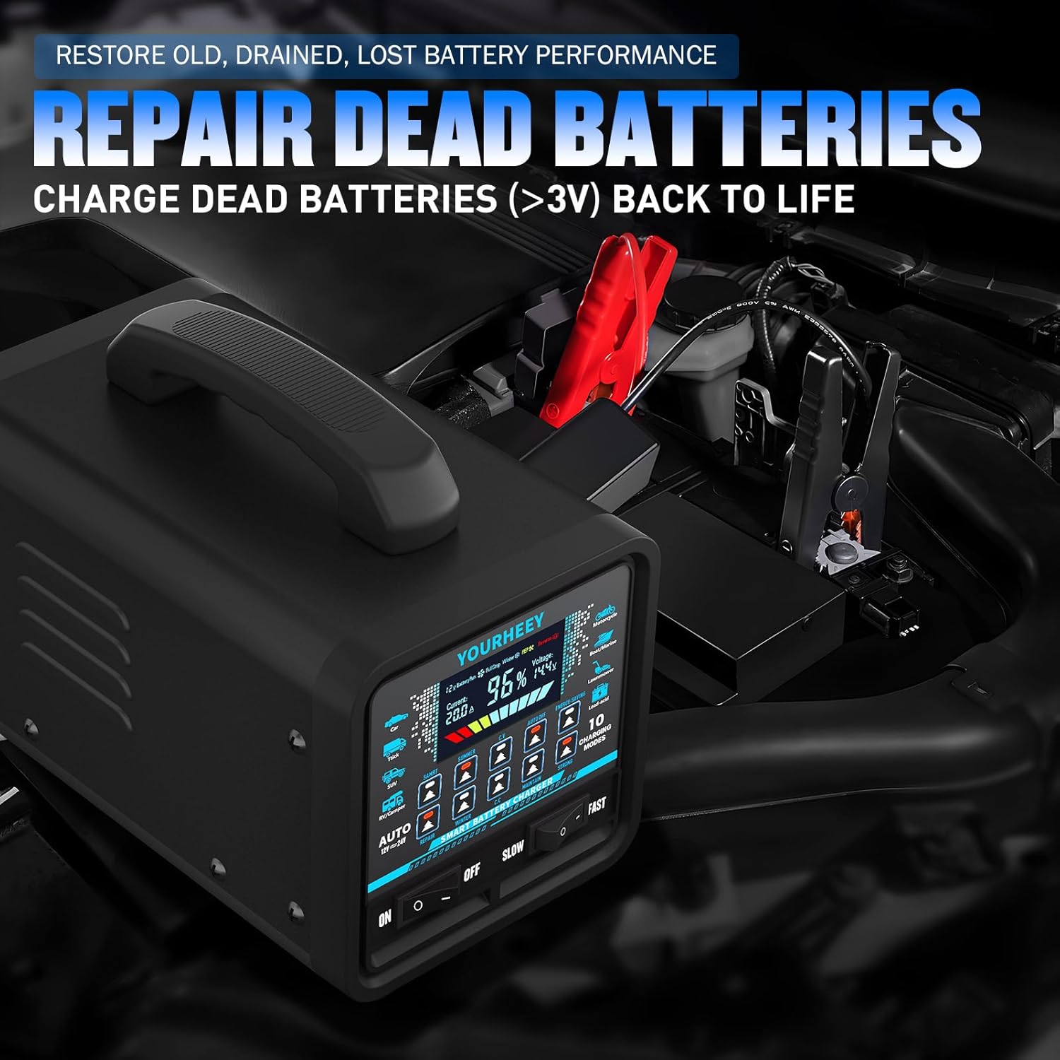 • 【Professional-Grade Battery Charger】Engineered with military-grade 13.1LB pure copper coils and heavy-duty aluminum alloy casing, the Yourheey Car Battery Charger delivers unmatched durability and 30% faster heat dissipation. This 12V 24V Battery Charger Automotive masterfully handles all lead-acid battery types - AGM, GEL, Flooded, EFB, Calcium, MF, and deep-cycle batteries (Note: Not compatible with lithium/LiFePO4). Its 20A max output ensures rapid charging for trucks/RVs while maintaining precision for motorcycles/lawn equipment. car battery charger heavy duty battery maintainer trickle charger