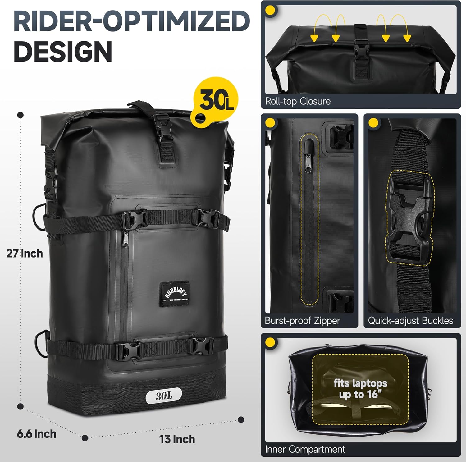 - Rider-Optimized Functional Design. The Gurblofy motorcycle tail bag is engineered with the rider in mind: Its heavy-duty PVC construction withstands all weather conditions, while storm-proof zippers ensure secure closure. The pack features quick-adjust buckles for instant sizing, and our patented textured handle design delivers a firm grip even with gloves. Multi-position straps distribute weight evenly across your back for fatigue-free riding adventures.