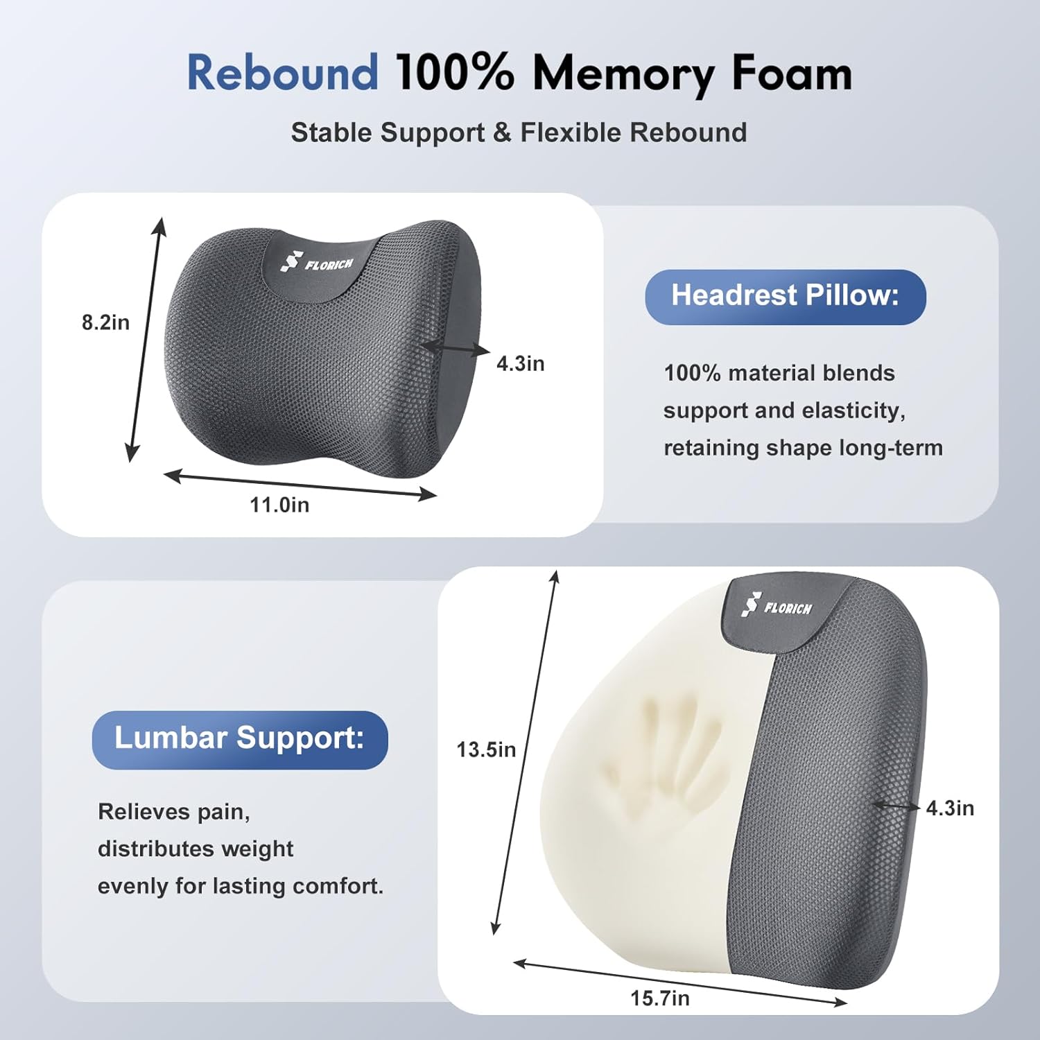 - Rebound Memory Foam: The headrest and lumbar support pillow made of 100% memory foam, cleverly combines stable support with flexible elasticity, ensuring excellent resilience and shape retention after long-term use without deformation or collapse. Pillow set effectively relieves pain, distributes weight evenly, and provides lasting comfortable support.