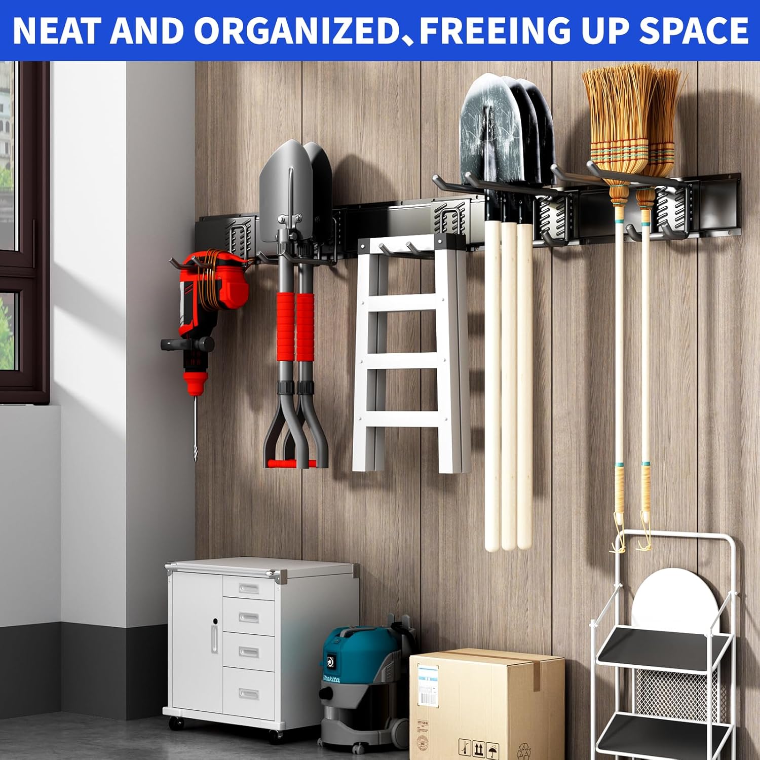 Garage Organization Tool Organizer Wall Mount, 48inch Heavy Duty Garden Tool organizer Storage System, Easy Install With 7 Adjustable Hooks, For Garage, Basement, Shed, Workshop(Black)