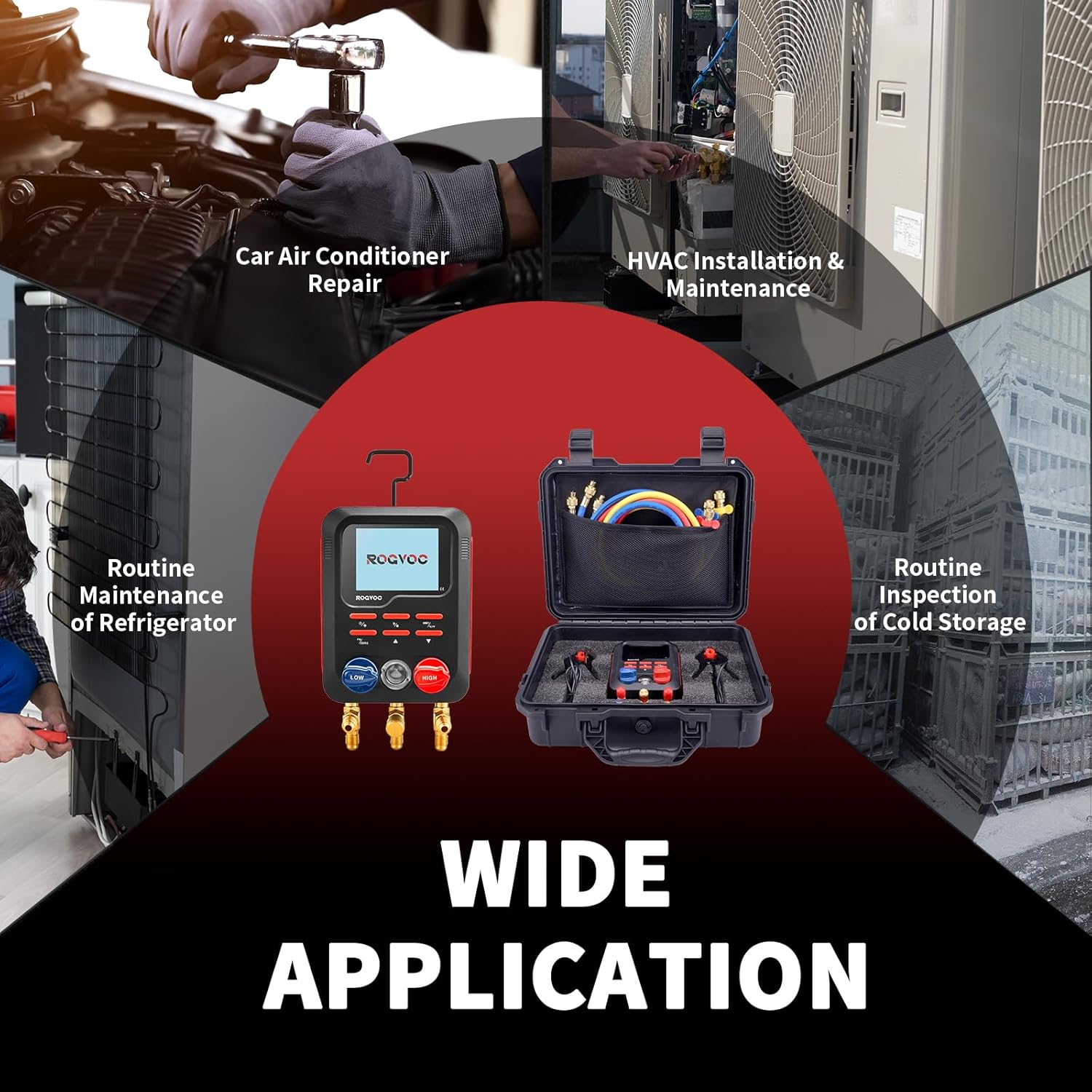 - DIGITAL MANIFOLD GAUGE SET: Rogvoc manifold gauges have functions such as refrigerant filling, dual pressure and air tightness test, vacuum degree test, temperature test, condensation evaporation pressure, etc. Built-in 93 types of refrigerant data can be switched or filled with different types of refrigerants according to needs. The 32-bit digital precision data acquisition unit has good data stability, making the pressure data measurement more stable and accurate.