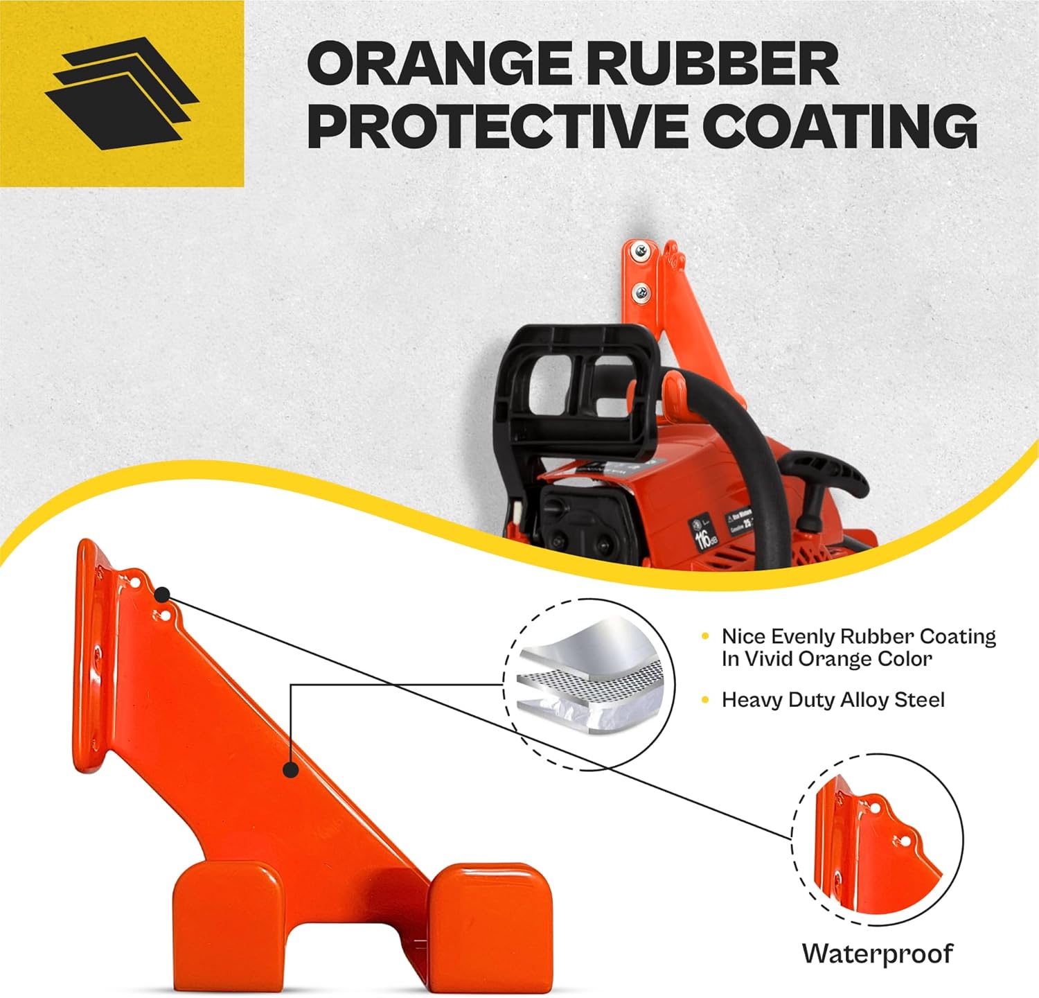 - Anti-Rust & Anti-Scratch Protection – Finished with a rust-resistant coating and lined with anti-scratch pads, this hanger keeps your chainsaw and tools protected from wear, corrosion, and wall damage—so your gear stays in top shape longer.