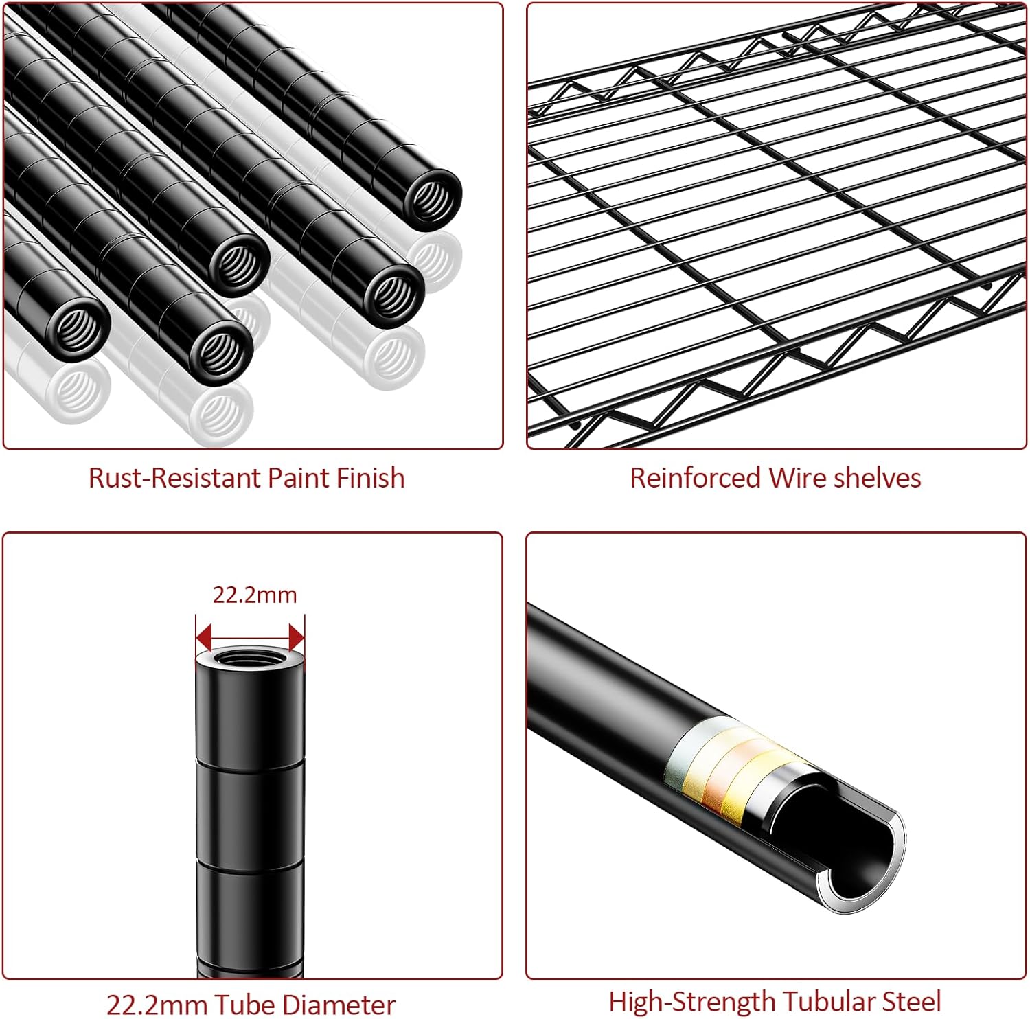 - ăHeavy-Duty Carbon Steel â Ultra-Stable DesignăBuilt with premium carbon steel and 22.22mm reinforced pipes, this shelving rack is engineered for strength and durability. Each shelf supports up to 350 lbs, with a total capacity of 1750 lbs, offering solid support for your heavy tools, appliances, or storage bins.