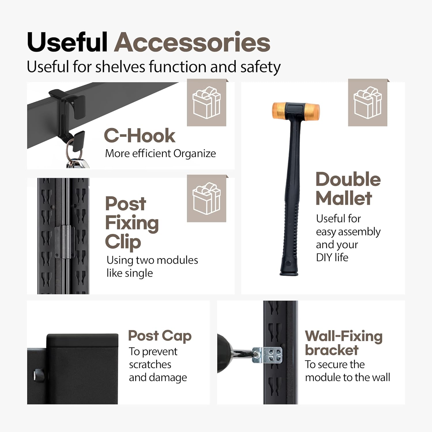 • UNIQUE BENEFIT OF ONLY HOMEDANT - You can make shelves as the basic flat shelf, rimmed basket-style shelf, or shelf blended with two (Basic flat+ basket). So you can load various types of things. Provide all purchasing customer special gift(Urethane Mallet, C-Hook, Post Fixing Clip, Wall Fixing Bracket) Provides assembly manual & videos to help you understand easier.