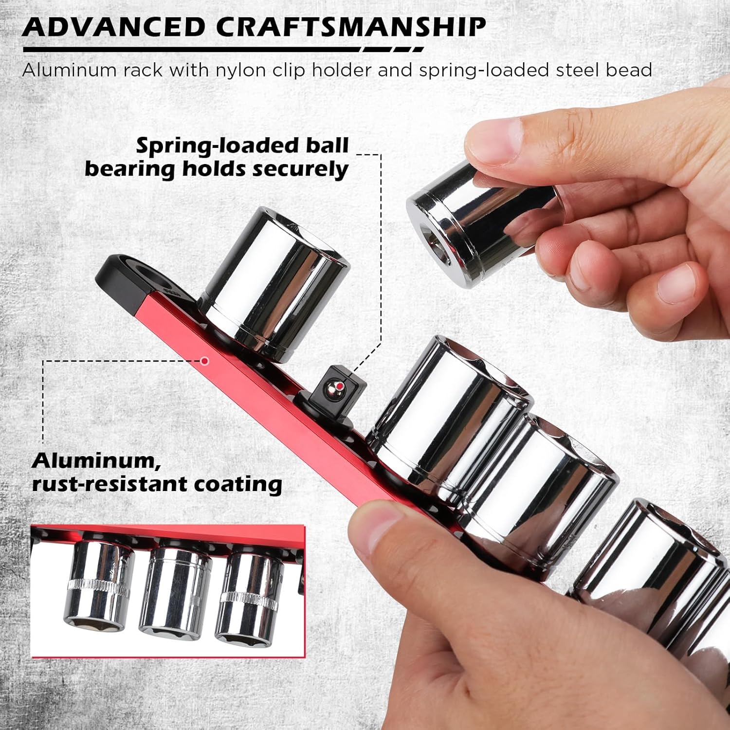 • SECURE GRIP - Featuring spring-loaded steel ball bearings and clip rail holder design, each socket snaps in place for impact-proof storage preventing accidental drops even when inverted, ideal for automotive accessories and workshops