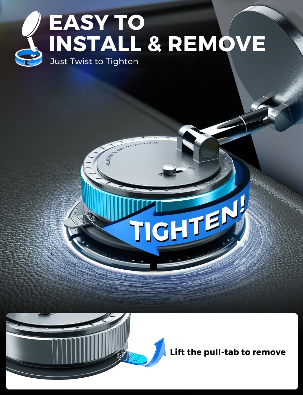 - ăEasy to Install & RemoveăThis vacuum magnetic phone stand features a one-step installationâsimply press the base against any smooth glass surface and twist to lock it in place. To remove, just twist in the opposite direction to release the mount. đ ď¸Pro Tip: When mounting on the dashboard, always apply the included 3M adhesive mounting disc firstâit creates a smooth, stable surface for stronger and more reliable suction.