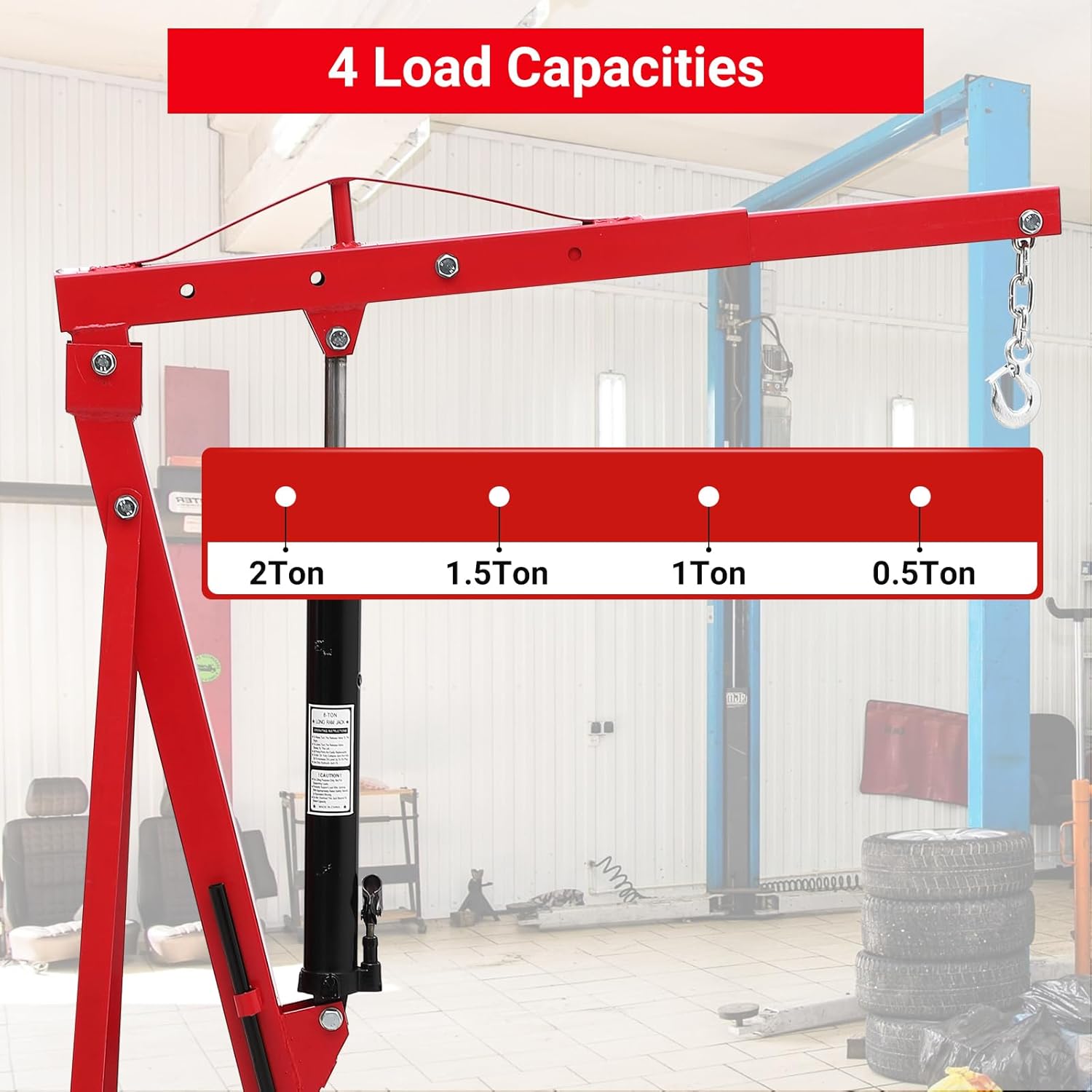 - Adjustable Positions & Folding Design: This crane offers four adjustable boom positions to accommodate your various lifting requirements with capacities of 0.5 Ton, 1 T, 1.5T and 2 Ton, lasting ram hydraulic cylinder. The extension arm and stand fold easily for convenient storage