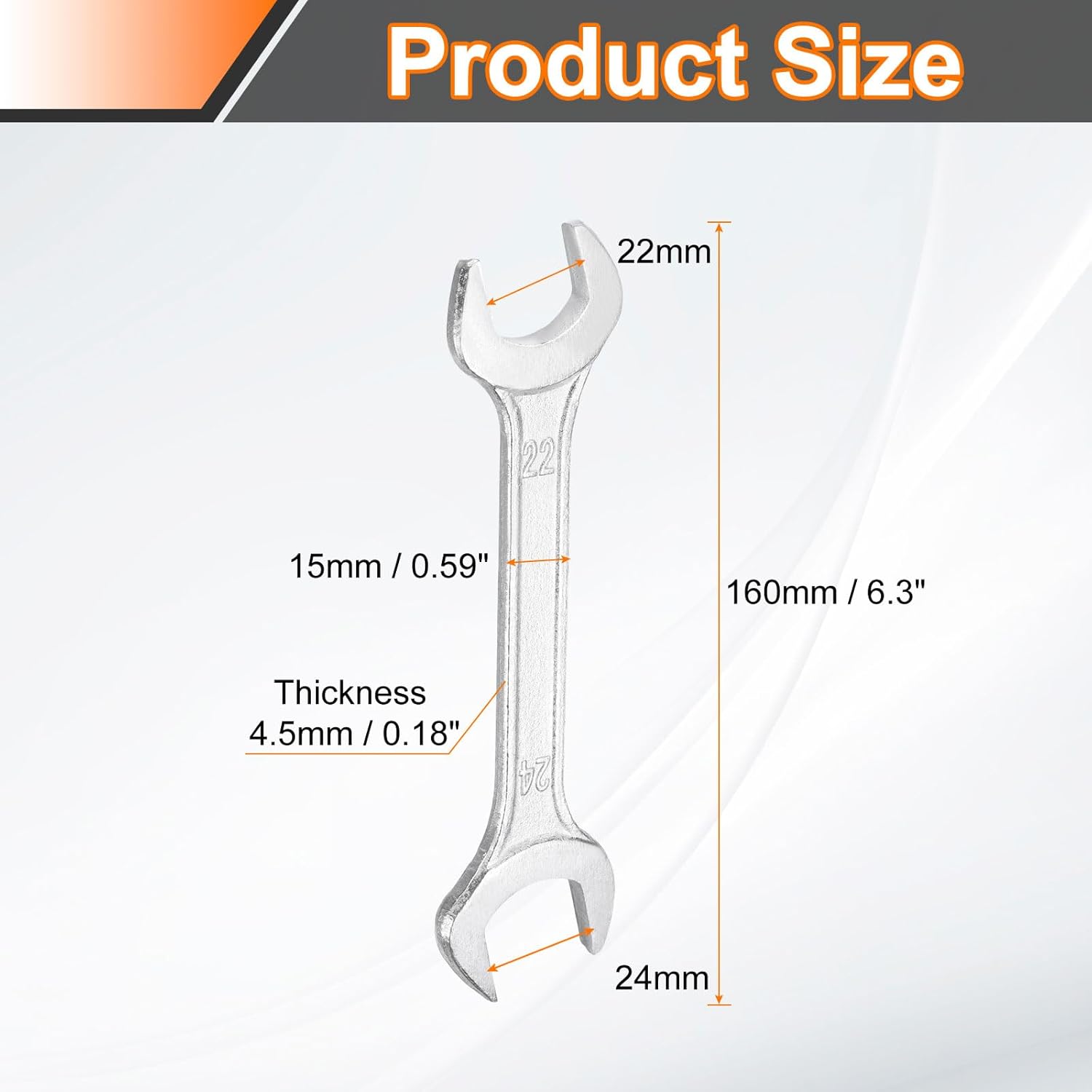 - Size - Metric Open End Size: 22mm x 24mm; Total Length: 160mm / 6.3"; Handle Width: 15mm / 0.59". Handle Thick: 4.5mm / 0.18". Size stamped on both ends of the handle for quick identification