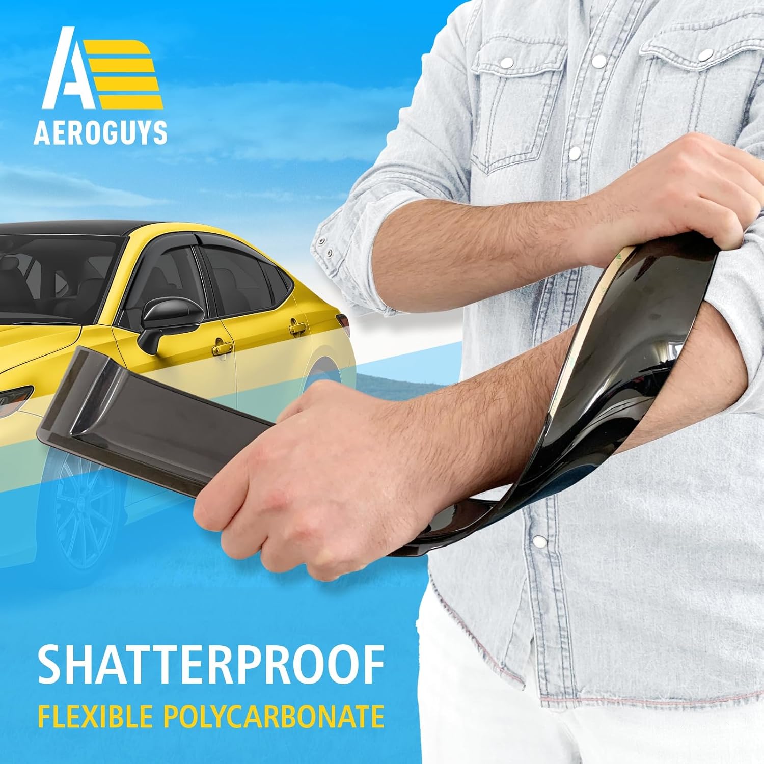 - No Tools Needed, Quick and Easy Assembly β These rain guards are very easy to fit. TAPE-ON INSTALLATION provides perfect fit for your car. Just slip it onto your carβs window and your job is done within minutes. There is no drilling or no tools required. Be sure that AEROGUYS window deflectors are water resistant, sun protective and will not bend, break or crack regardless of the weather conditions.