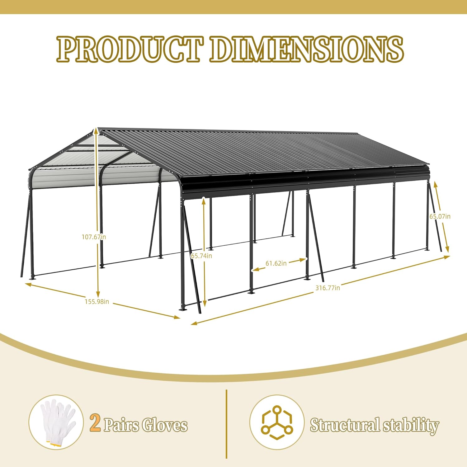 - ā šš„š„āššššš”šš« ššš«š©šØš«š: Sized at 13 Ć 26.5 ft, this metal carport provides year-round protection for your car, boat, and outdoor gear against wind, rain, and snow. Protruding eaves combined with rainproof tape seal out leaks during heavy downpours. Say goodbye to parking headaches under reliable, all-season heavy duty car ports.