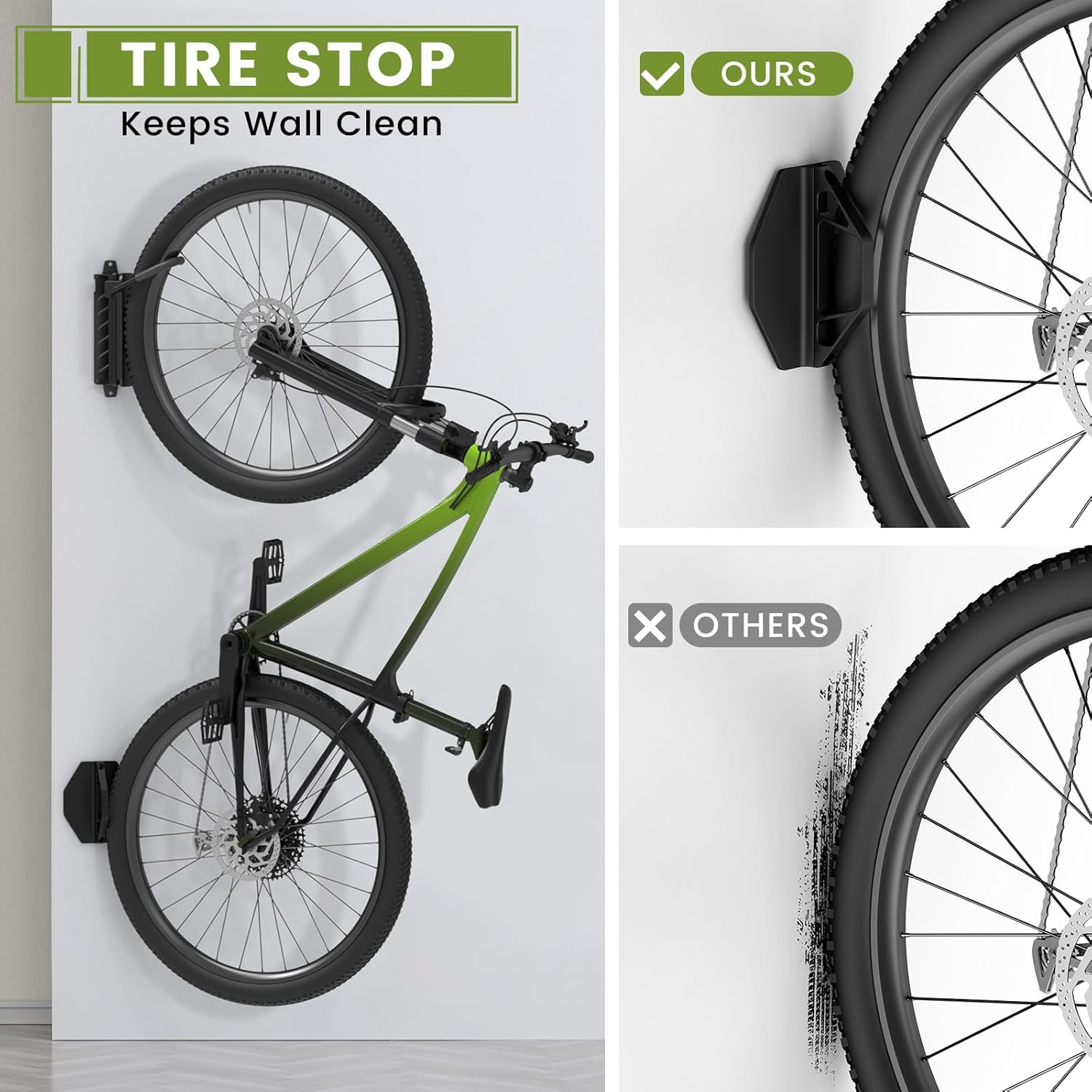 - Save Space, 150° Swivel Design: Swivel design with bearing system, bike storage rack easy to store your bikes in the center, left, or right angle position, offering a convenient storage solution for parking around your car and in your apartment. The swivel system also allows you to store your bikes close to the wall. Simply hang the front wheel in place, place the rear wheel on the stabilizer, and rotate the bike wall rack to the desired angle.