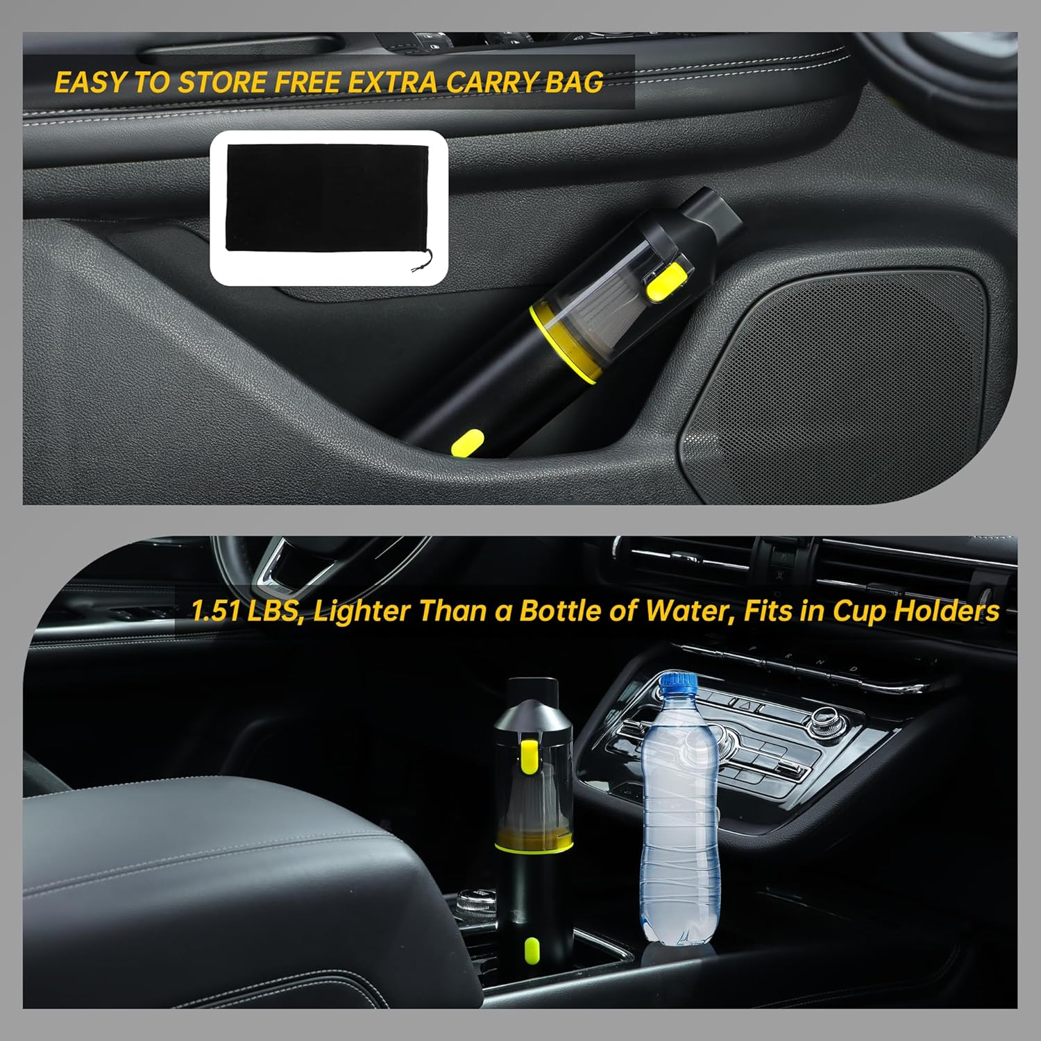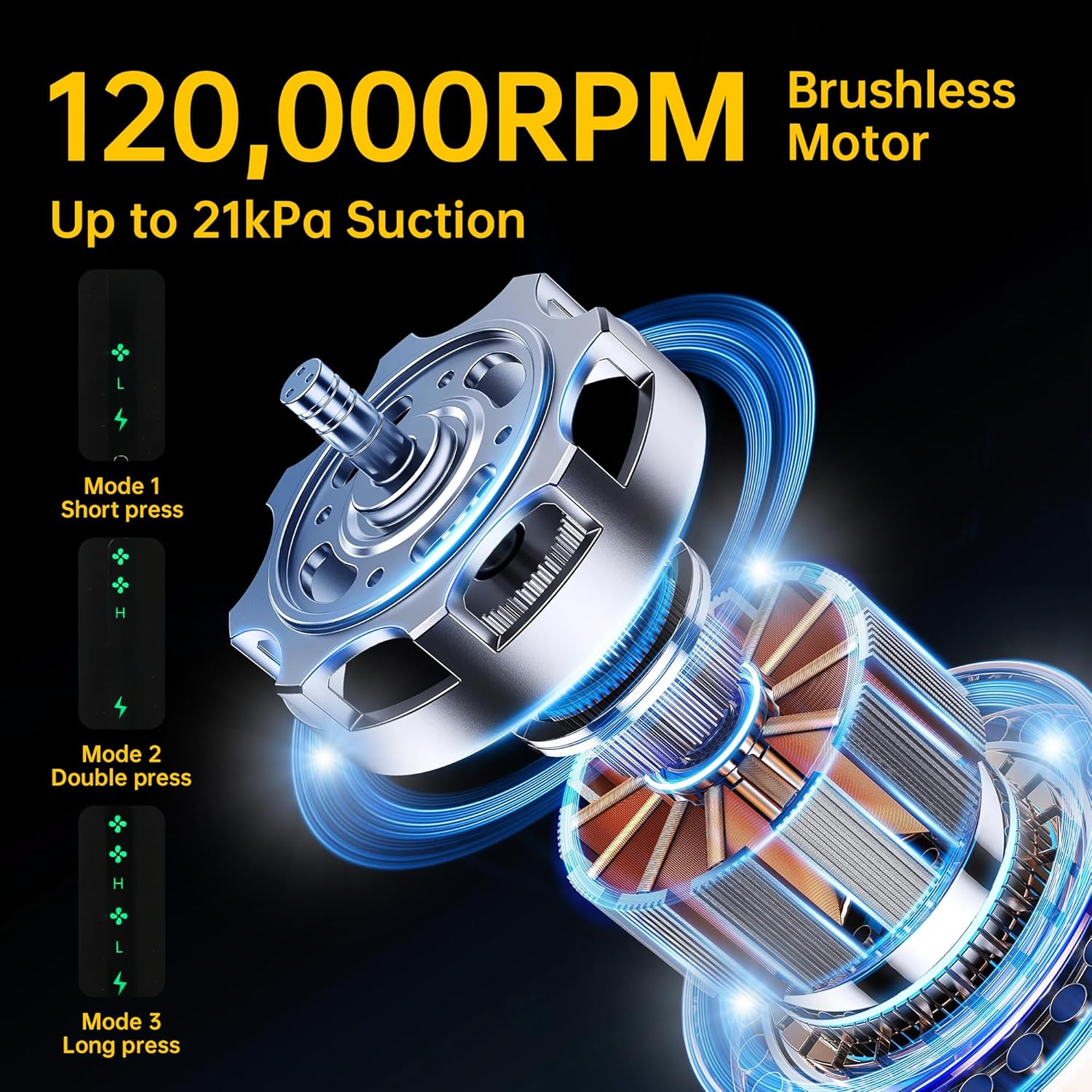 - Industrial-Grade 21,000Pa Suction in a Pocket-Size Build: Equipped with a 120,000rpm brushless motor, this mini car vacuum cordless delivers up to 21kPa suction—strong enough for sand and debris, yet gentle on delicate surfaces. This car vacuum has three power modes: press once for low, twice for medium, and press and hold after the second press to activate the max mode.Choose between 40-minute Low Power mode for light messes or 20-minute Max mode for tougher cleanup tasks. Weighs just 688g for easy one-handed use.