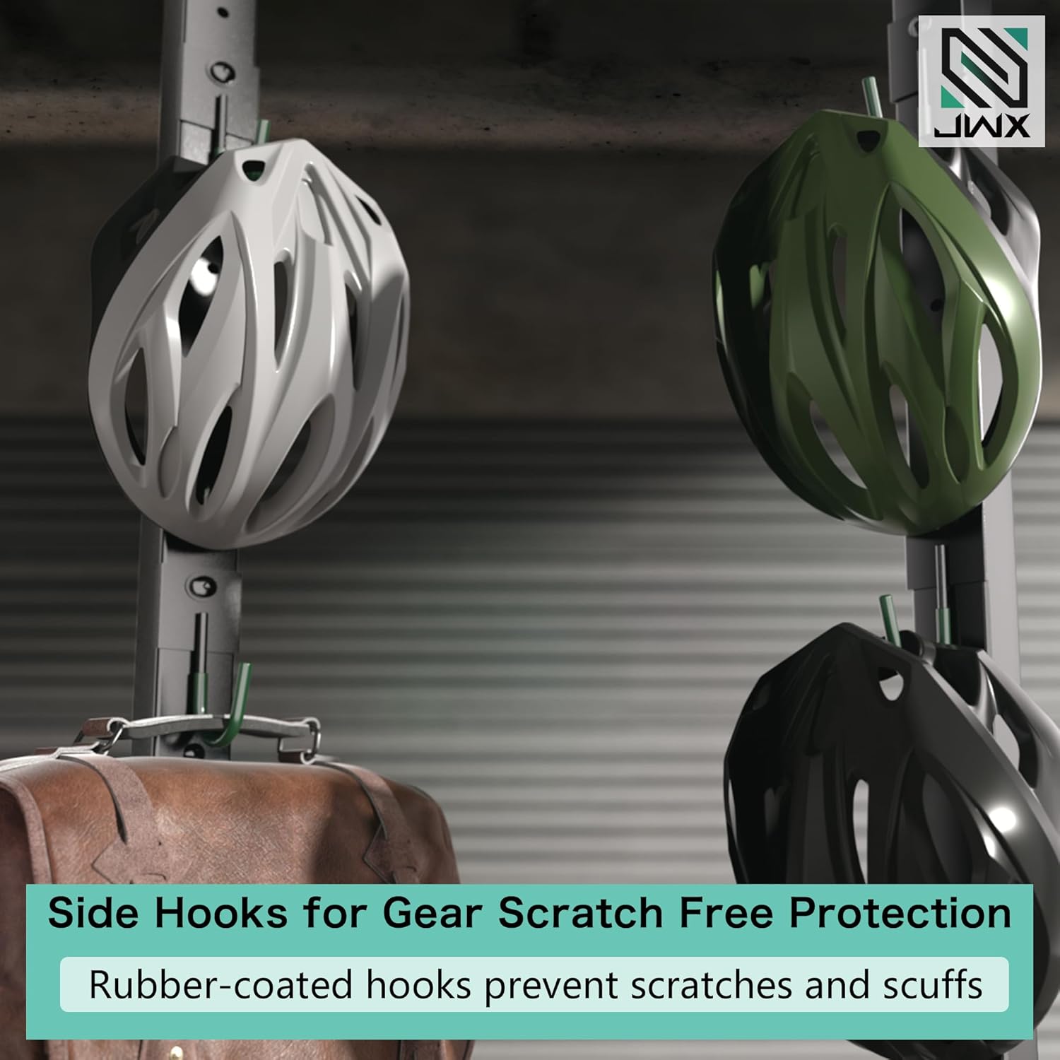 - ăFully Adjustable Hooks for Any Bike Typeă Our signature green, rubber-coated hooks are not only eye-catchingâtheyâre also fully adjustable. Customize spacing with threaded locking knobs to easily fit fat-tire bikes, e-bikes, kidsâ bikes, or road bikes without handlebar interference.