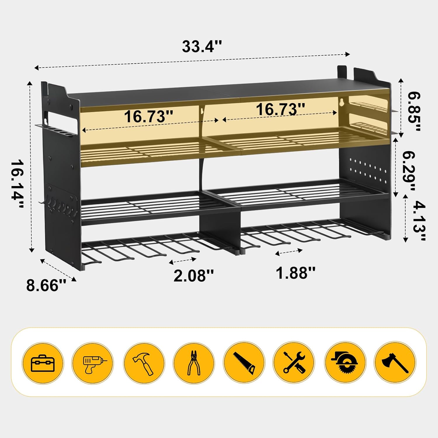- Industrial-Grade Load Capacity: Constructed with reinforced cold-rolled steel framework and certified through dynamic load-bearing testing, this wall-mounted rack securely holds heavy-duty tools like drills and cutting machines. Its robust design ensures safe storage with zero risk of structural failure, even under maximum capacity