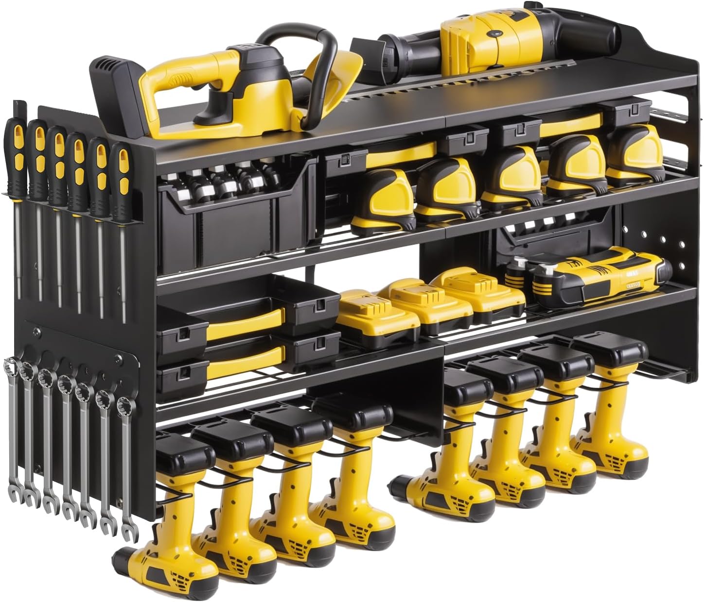 - 4-Tier Modular Storage System: Equipped with double-sided drill bit panels, 6 adjustable shelves, 8 drill slots, and a top hook zone, this system organizes batteries, toolboxes, screwdriver sets, and more. The 360° ergonomic layout enables tool retrieval within 30 seconds, eliminating search time
