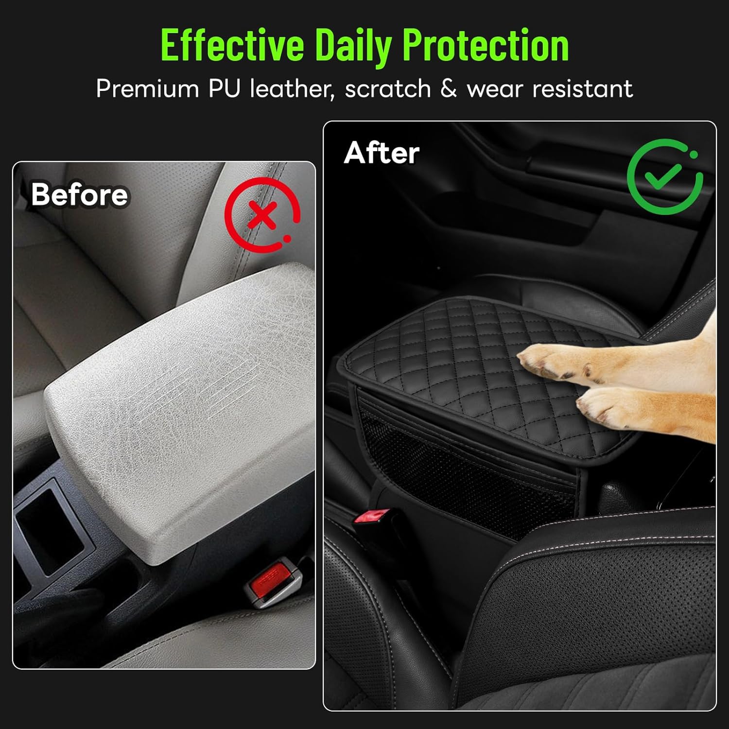 - Ultimate Protection: Made from premium PU leather, this armrest cover with side pocket offers comprehensive protection for your car’s center console. It shields your armrest box from dirt, spills, sweat, scratches, stains, pet claws, and daily wear, ensuring it stays in pristine condition. Beyond its functionality, the cover also enhances your car's interior with a sleek and stylish touch