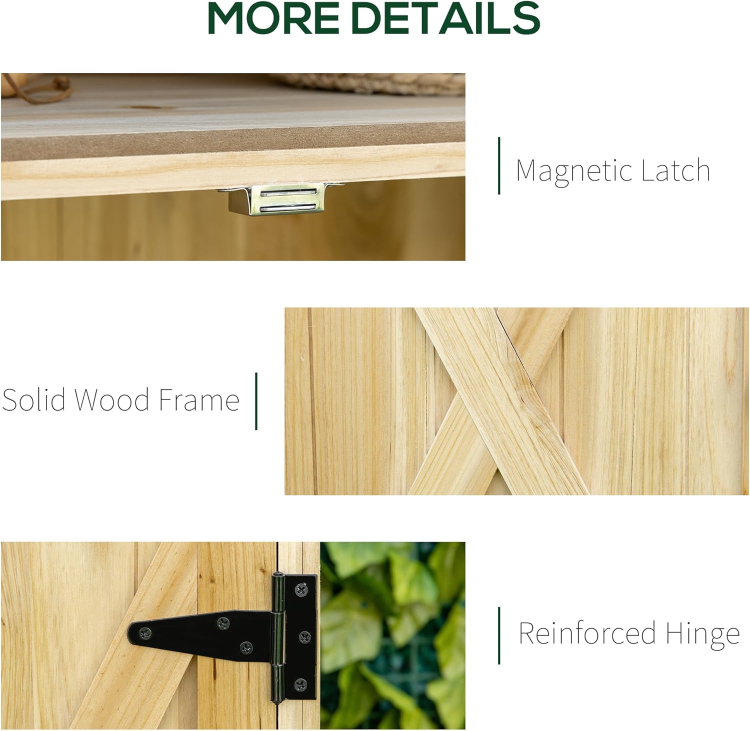 - Farmhouse Aesthetic: With its charming X-bar farmhouse style doors and natural wood finish, this Wooden Garden Shed adds a rustic touch to your garden, lawn, or garage, enhancing the overall aesthetic of your outdoor space.