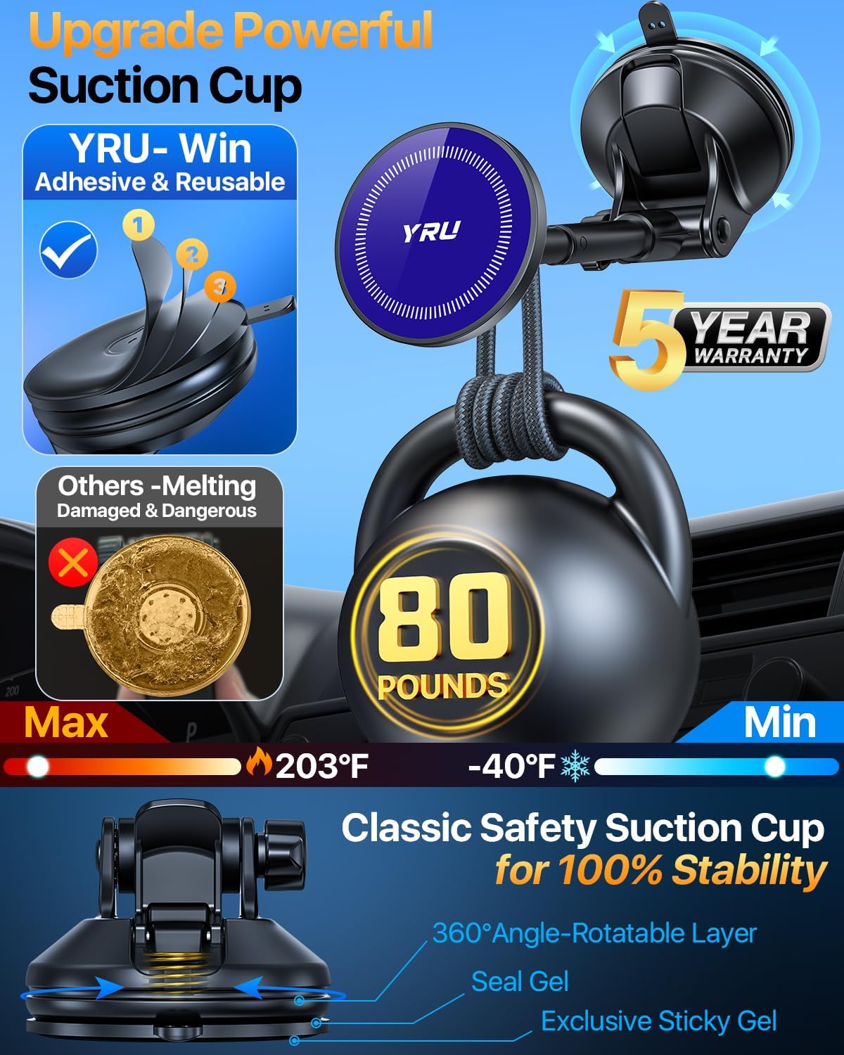 - [Strongest Magnets, Super Stability] Overcome all weaknesses of the traditional magnetic holders, YRU car magnetic phone mount for iPhones uses the King of Magnetism "NdFeB Magnets" which is powerful enough to hold 15 large phones. Grip the phone securely on braking or rough roads. Maintains its strong magnetism in the harsh environment of -45°F~215°F