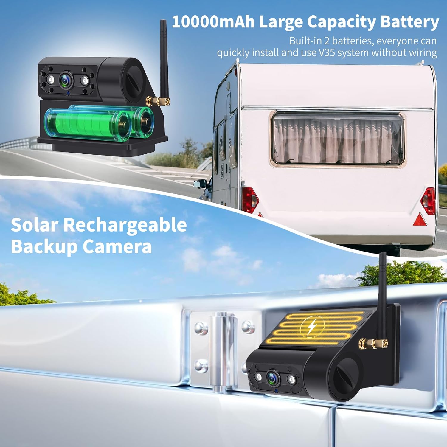 - 【Solar-Powered for Energy Efficiency & USB Charging】The wireless solar backup camera has a unique solar panel that converts sunlight to electricity for stable and eco-friendly charging. Bulit-in 10000 mAh rechargeable battery, the wireless backup camera provides an ultra-long continuous use on a single charge. The camera automatically enters sleep mode when the monitor is off to reduce power consumption, significantly extending battery life and reducing energy consumption, ideal for long trips.