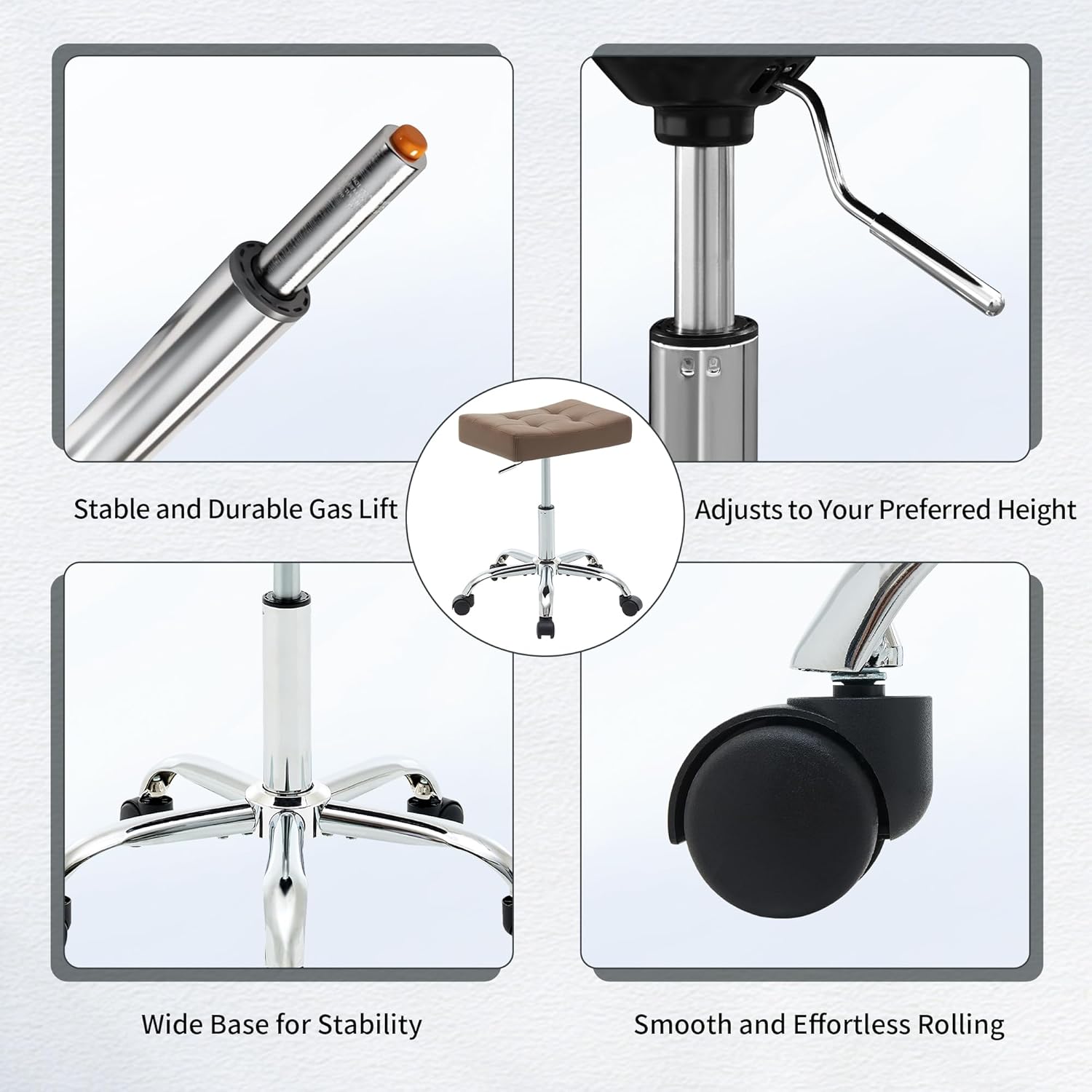 - Smooth Rolling Wheels: The swivel stool features 360° smooth-rolling wheels that glide effortlessly across floors. These wheels help prevent hair and debris from tangling, ensuring consistent performance and easy mobility. While not completely silent, they reduce noise during movement and protect floors from scratches, making the stool well-suited for busy offices, conference rooms, and other professional workspaces