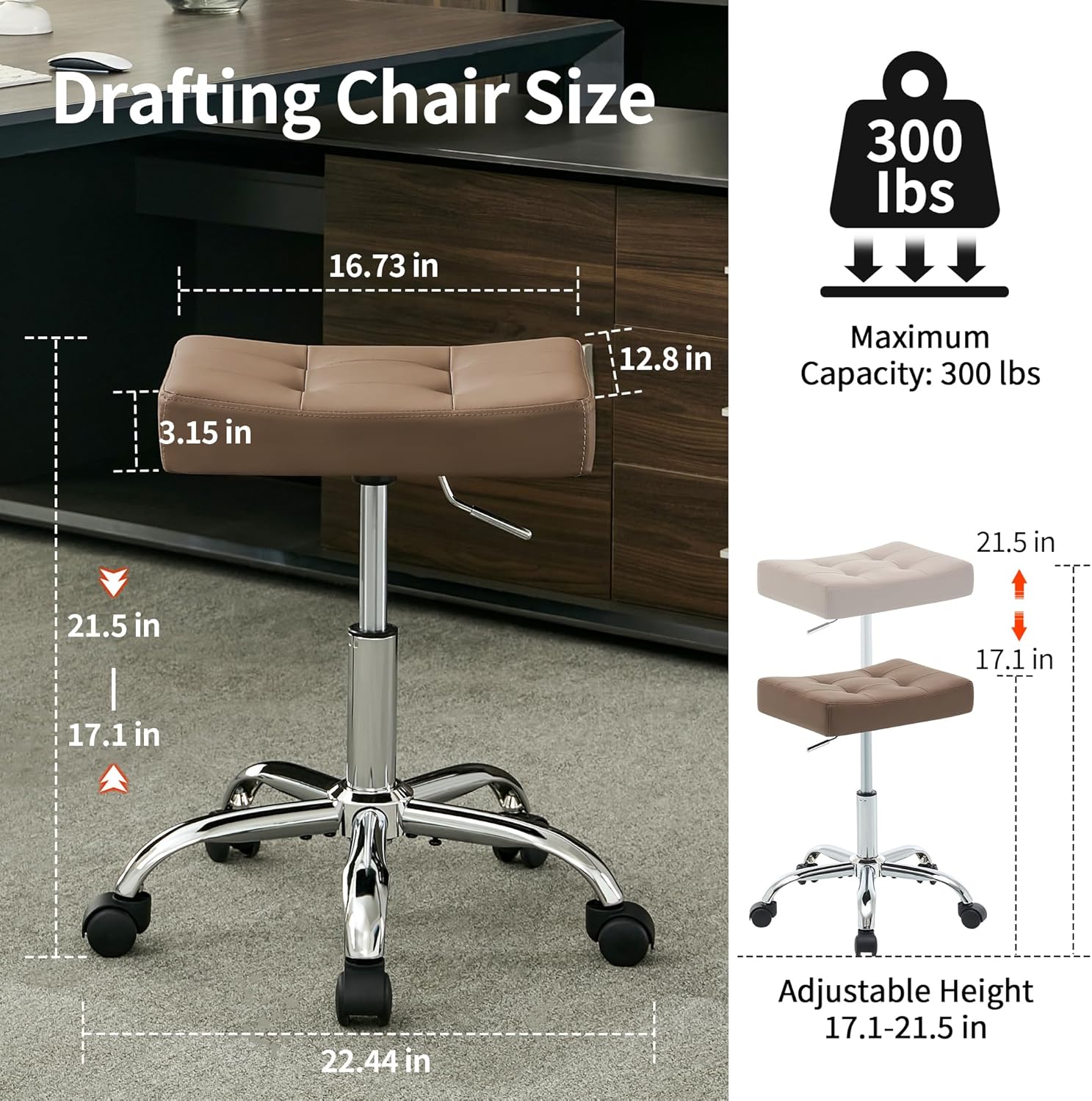 Ergonomic Desk Stool with Wheels (Adjustable Height 17"-21") (300lbs Capacity) Faux Leather Office Stool (Coffee Brown)