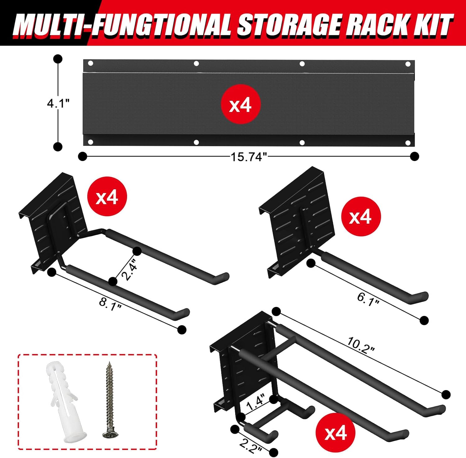 64 Inches Garage Organization, Wall Mount Garden Tool Organizer, 880lbs Adjustable Heavy Duty Metal Hanging Hooks, Garden Tool Storage Rack for Garage, Yard, and Shed (4 Racks, 12 Hooks)