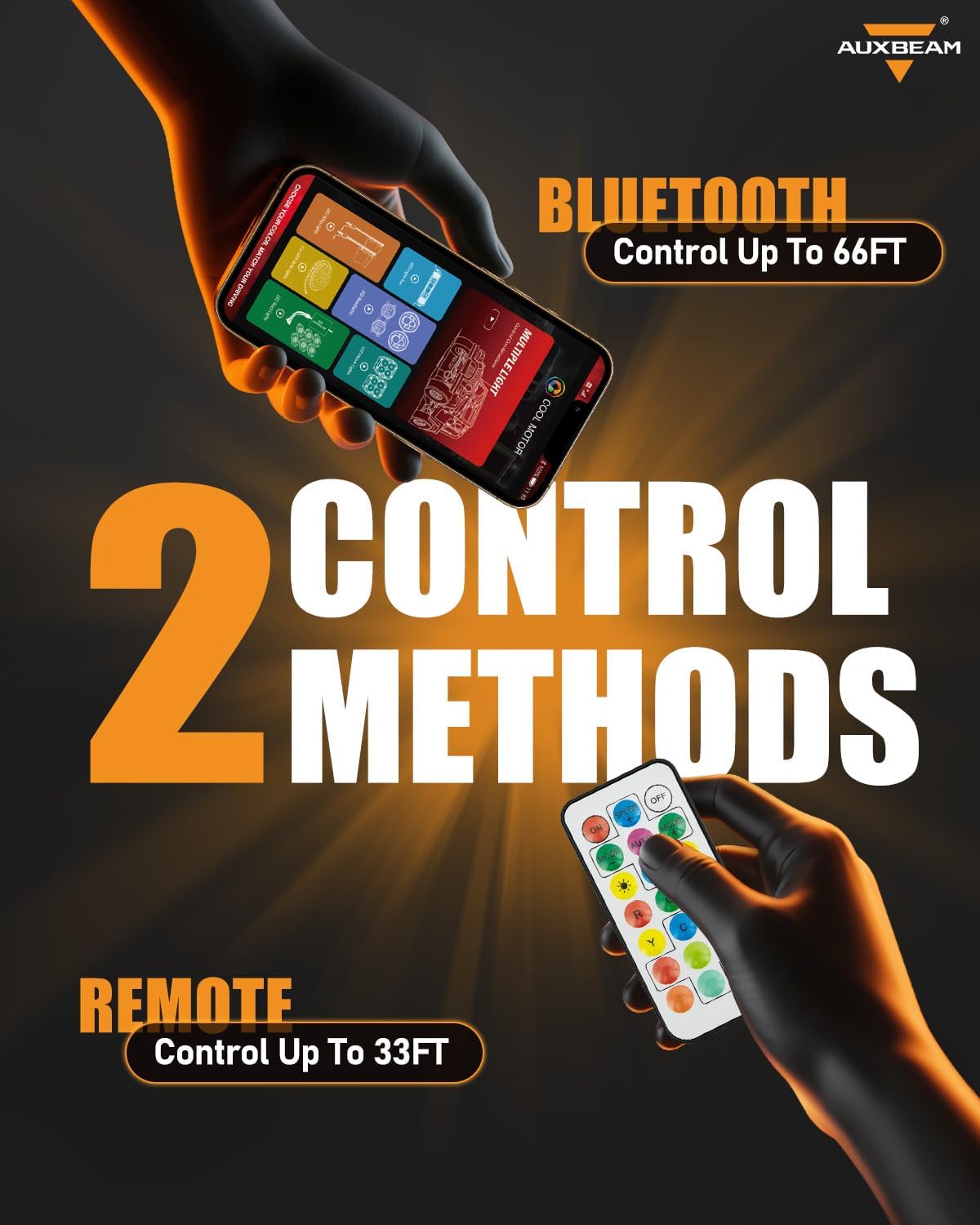 - APP & REMOTE CONTROL:‌ Take full command via the ‌Cool Motor Bluetooth App‌, or ‌the included RF remote!‌ Choose from ‌180 dynamic lighting modes‌, sync lights to ‌music beats (Music Mode)‌, or activate ‌voice-responsive lighting (Voice Mode)‌—where rock lights react instantly to your ‌voice pitch and rhythm‌. Use ‌Group Management‌ to effortlessly sync multiple AUXBEAM lights compatible with Cool Motor—all from one app