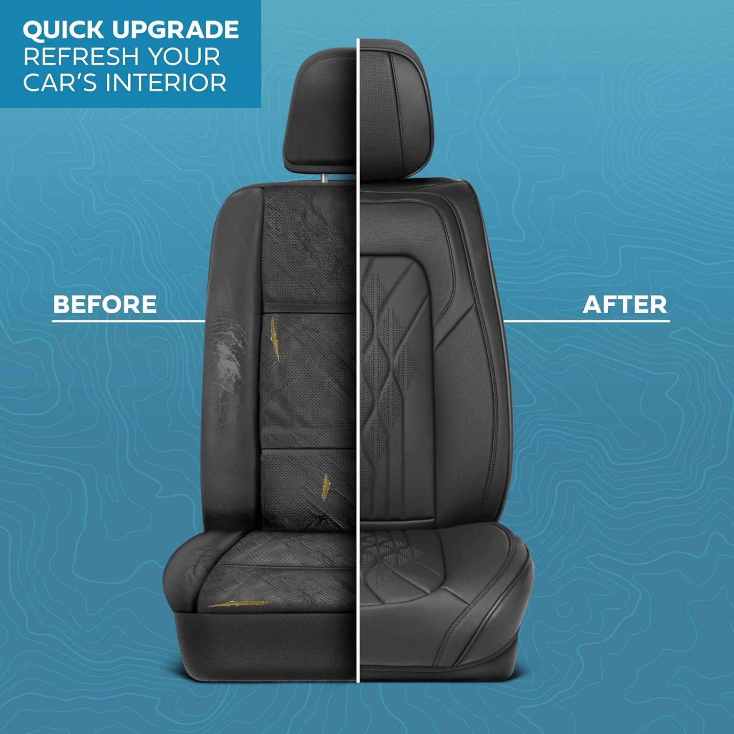 - ULTIMATE PROTECTION: MotorBox faux leather car seat covers offer ultimate protection against spills, stains, dirt, and wear. Designed to shield your seats from daily damage, these covers help maintain the original condition of your car’s interior, ensuring durability and extending the lifespan of your vehicle’s seats. Not just for cars, these are leather seat covers for trucks & SUVs too!