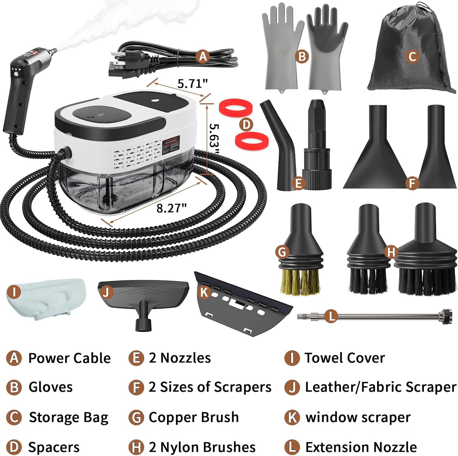 - Compact & Portable Steam Cleaner: Measuring only 8.27'' x 5.71'' x 5.63'', this handheld steam cleaner is designed for easy portability; Equipped with a 4.92ft spray gun hose and a 6.56'' power cord, it offers flexibility for both indoor and outdoor use (steamer for car detailing)