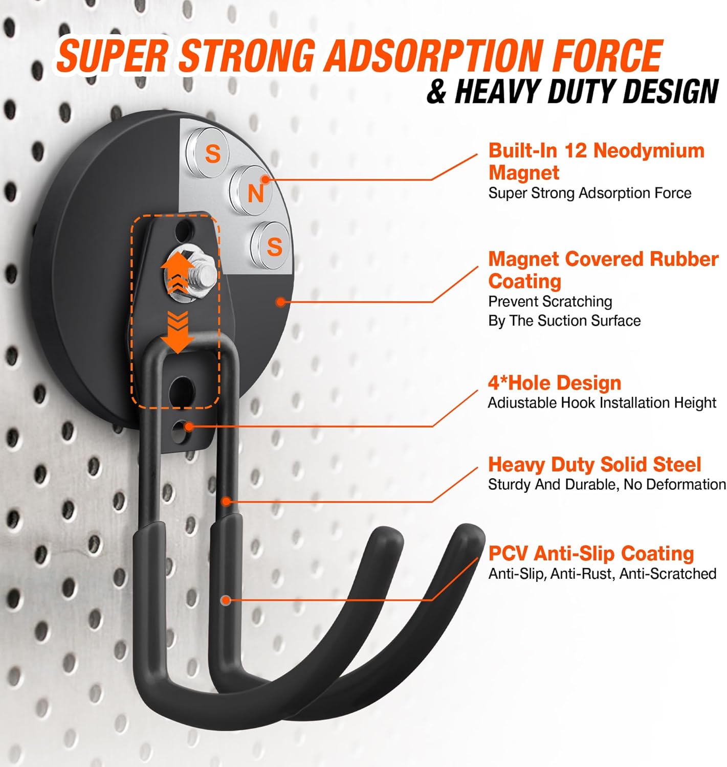 - š§²[2PCS Magnetic Hooks For Hanging] Large strong magnetic hook present an efficient solution for optimizing vertical storage space within your garage organization system. These multifunctional extra magnet storage hooks are suitable for both indoor and outdoor settings, including garages, gardens, kitchen, warehouse, cruise cabin, utility rooms and indoor/outdoor