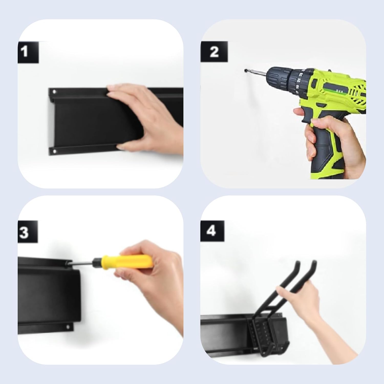 - 【Rich Components】 Garage wall tool hangers include 4 main frames (16 inches), 4 pcs double-layer hooks (10 inches), 4 pcs single-rod hooks (6.2 inches), 2 pcs double-rod hooks (8.9 inches), 4 nylon storage compartments, and various screws and accessories. The diverse hook types accommodate different tools, enabling a customized storage solution.