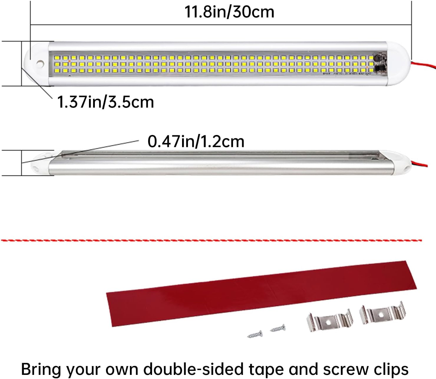 - This 12v light fixtures adopts 11.8inch extension connecting cable, anti-scratch aluminum alloy foundation and efficient light transmitting PC film to achieve ultimate durability, flexibility and efficient heat dissipation. Stainless steel clips, screws and strong self-adhesive that come with the package makes the installation of this LED interior light strip a breeze and optional