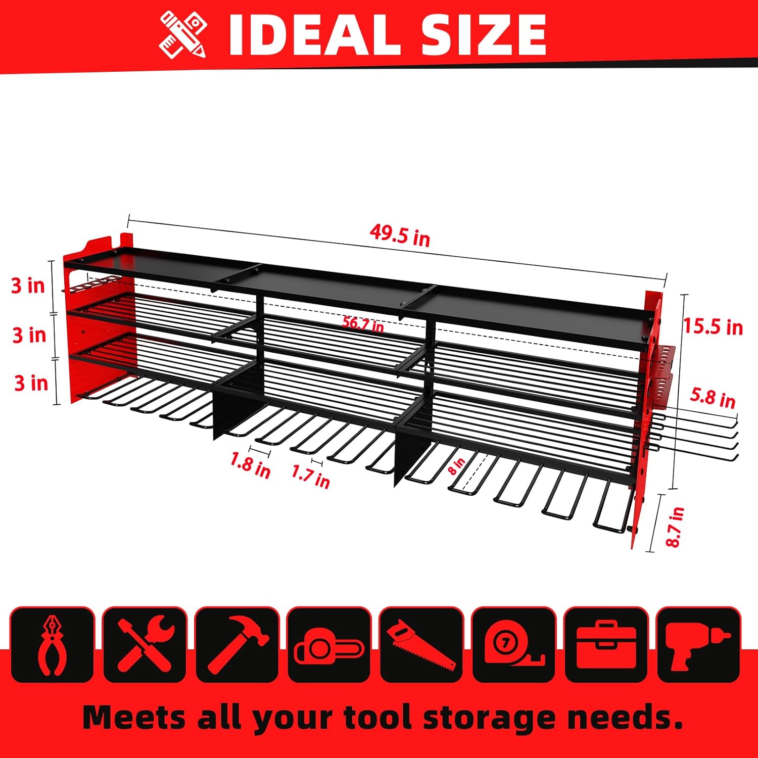 - 【EASY TO ASSEMBLE】Our cordless tool organizer is Quick 10-15 min setup (clear instructions included), a perfect power tool rack for your workshop,only need to connect the plate with screws and hang it on the wall.We provide clear installation instructions and accessorie,Installation size: 49.5 in (L) × 8.7 in (W) × 15.5 in (H),4 Pcs additional 5.8" detachable hooks are included.