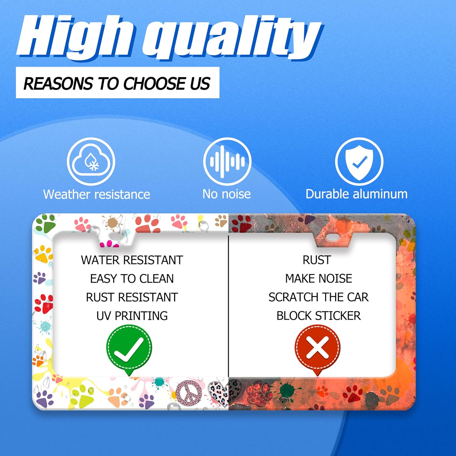 Dog Cat Paw License Plate Frame Colorful Paws License Plate Stainless Steel Funny License Plate Holder for Men Women Universal Animals Car Accessories Decoration 12.3" x 6.3"