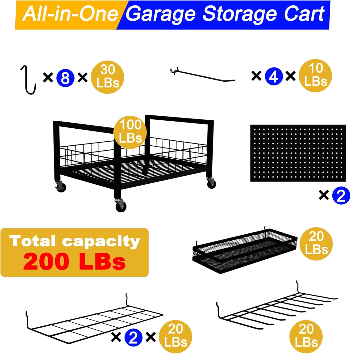 All-in-One Garage Storage Cart with Locking Wheels – Heavy-Duty Tool Organizer with Rack, Pegboard & Hooks & Accessories – Ideal for Garage, Garden, Yard – Utility Cart with Versatile Storage