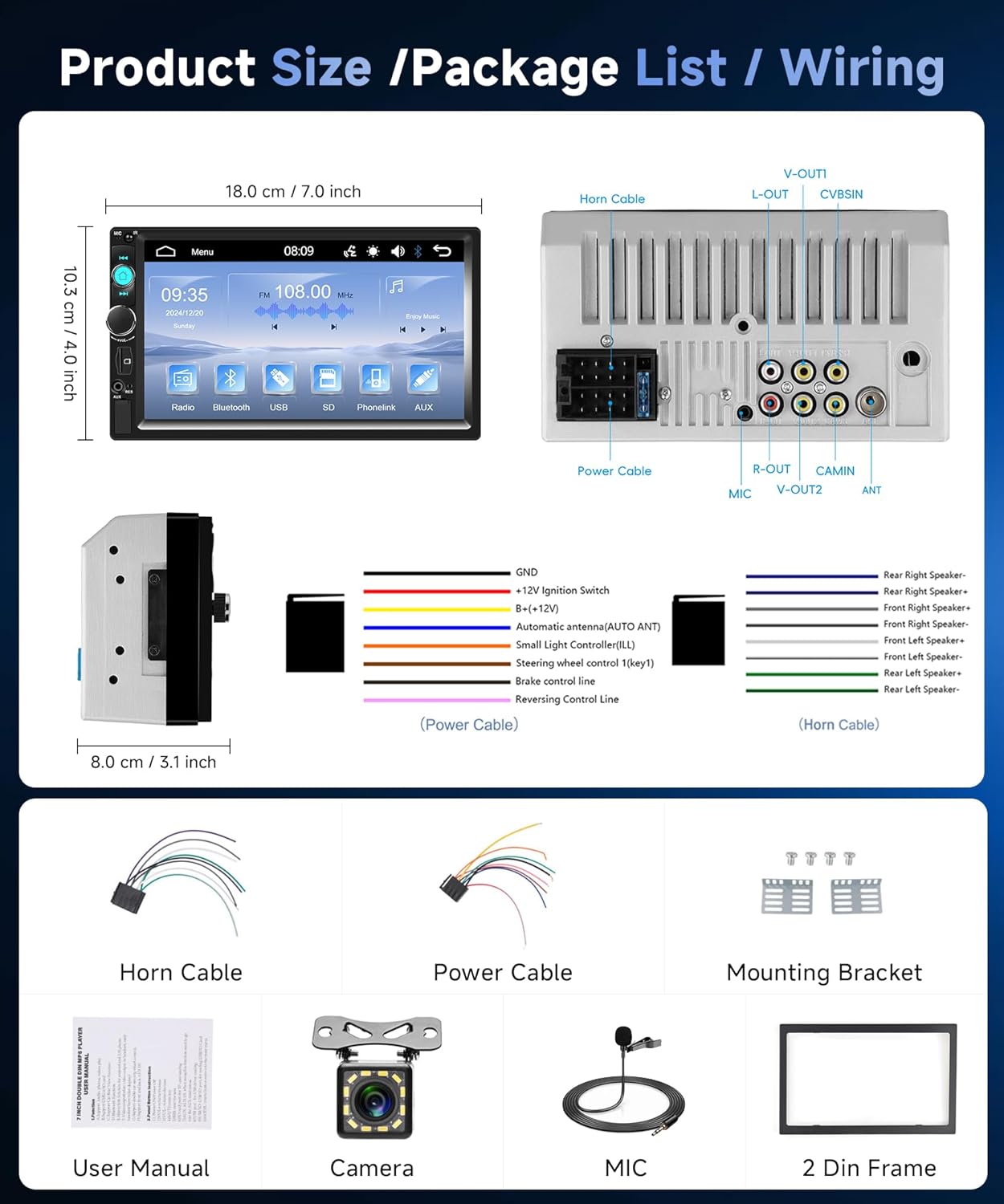 - 【7 Inch Touchscreen Car Radio 2 Din】The installation dimensions of the car radio are 180*103*80mm. Car radio with 7 inch HD touch screen. Bluetooth car radio supports USB/SD/AUX In/TF. Supports audio/video in and out.Car Radio with Microphone. Supports Colorful backlit buttons,multiple sound adjustments (SEL),electronic hardware sound effects (EQ) processing. Car radio with square frame for a better fit in your car's center console.