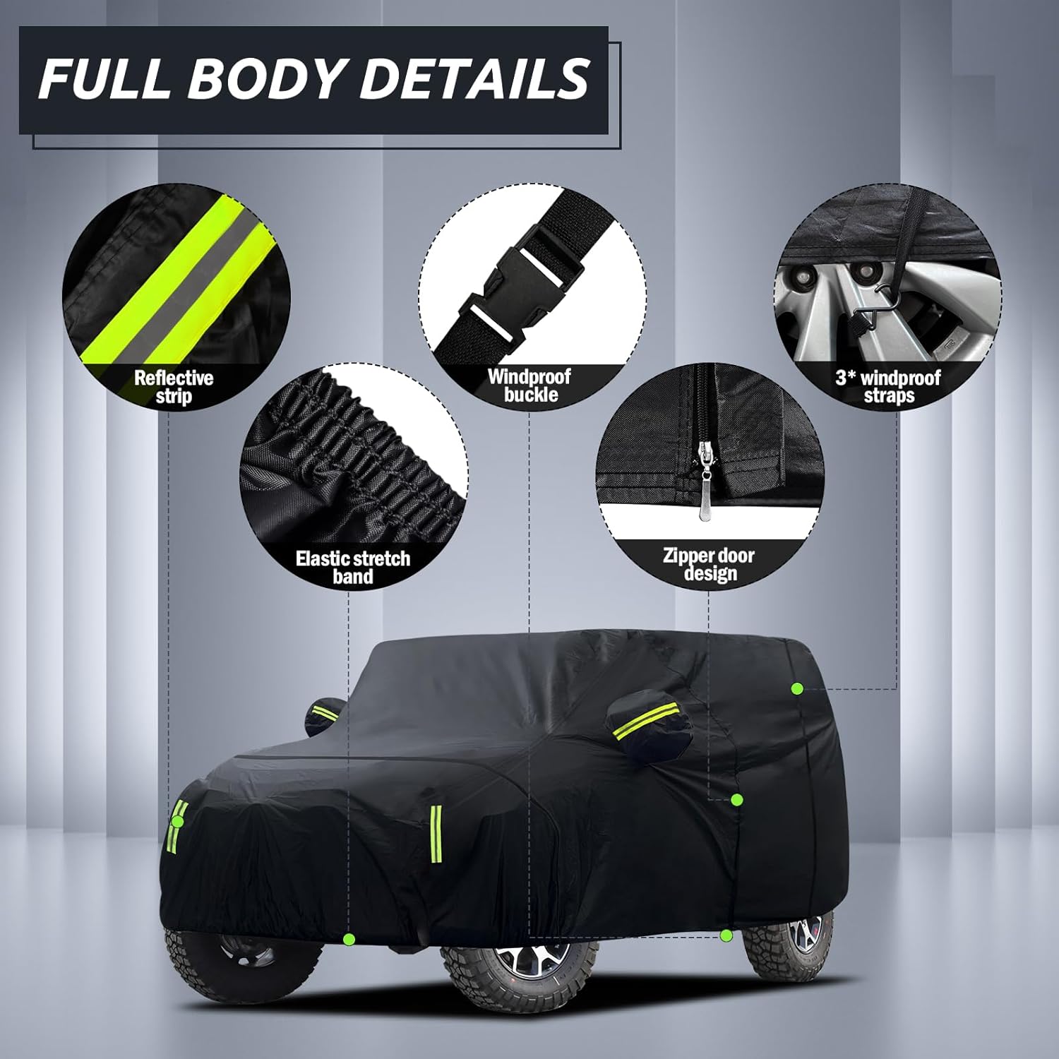 - ăAll-Weather Protectionă This car cover with soft cotton lining is custom design for Jeep Wrangler 4 Door 2006-2025 JK JL. It provides comprehensive protection for the car from all-weather factors in the four seasons of spring, summer, autumn, and winter, such as dust, snow, industrial pollution, bird droppings, leaves, pollen, acid rain, ultraviolet light, intense sunlight, heavy rain, etc.
