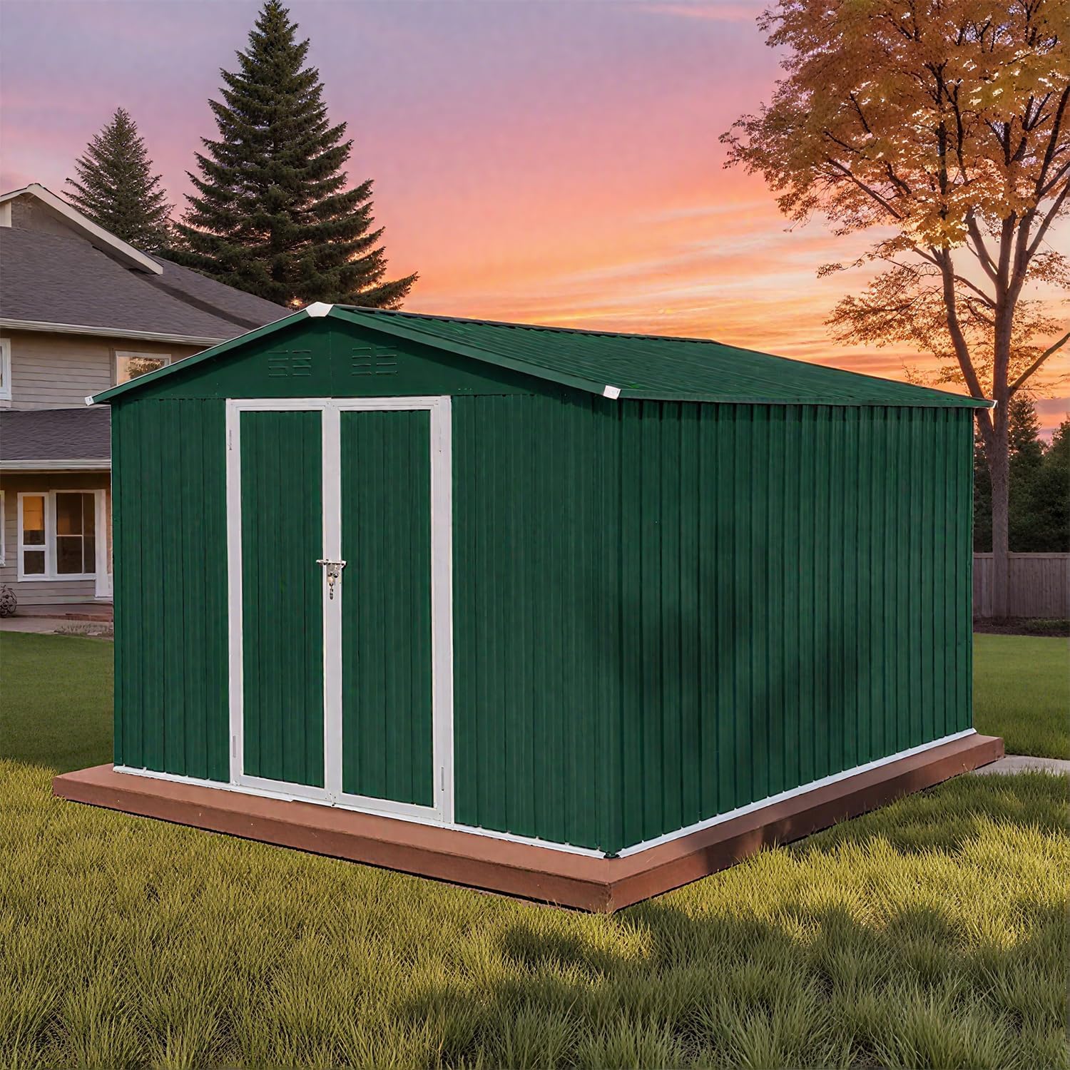 10 x 8 FT Outdoor Storage Shed, Metal Garden Tool Shed with Slooping Roof, Lockable Doors and Aluminum Frames, Easy to Assemble for Garden, Patio, Lawn, Green