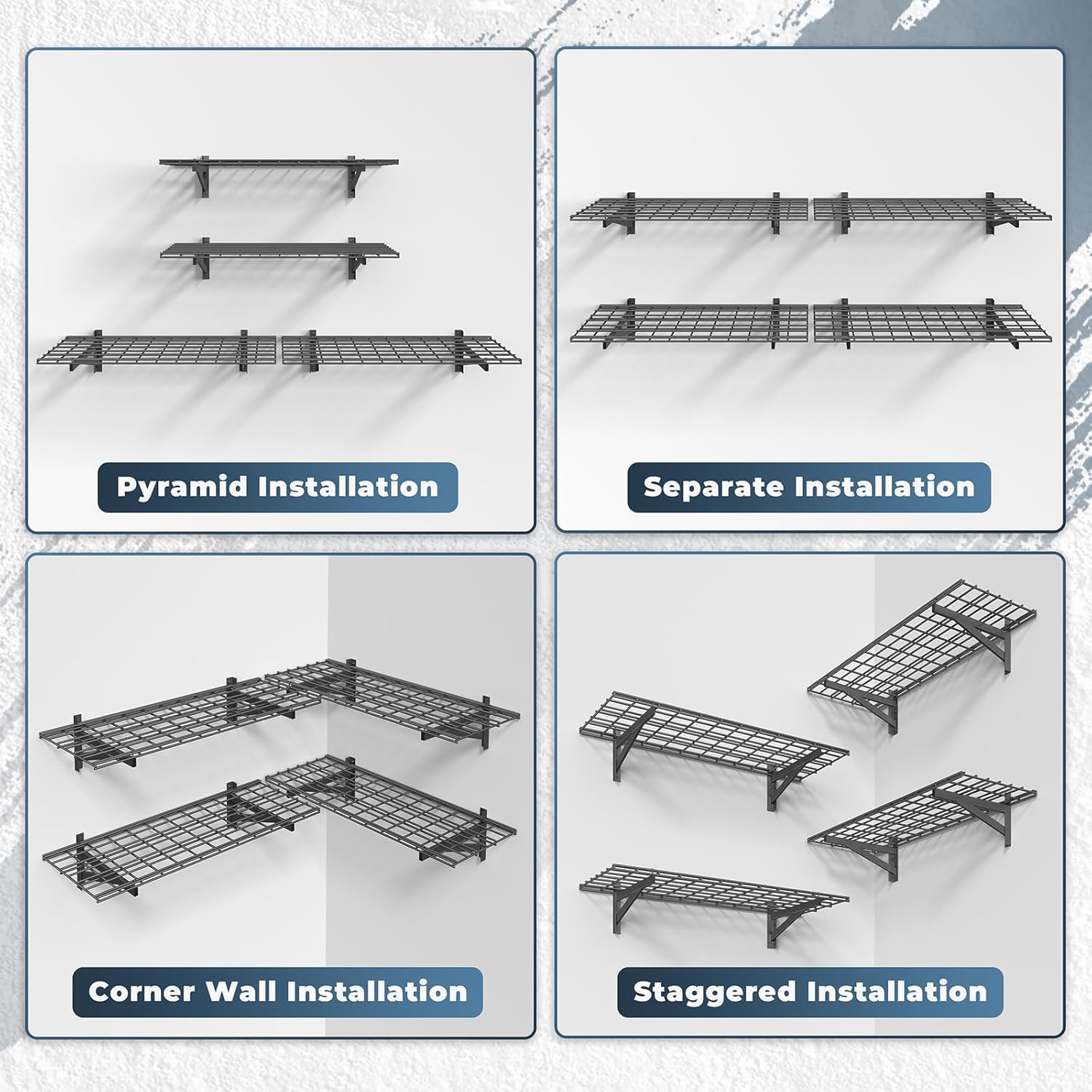 - 🏆【Heavy-Duty Load Capacity】- Jusgym garage shelving wall mounted system is engineered with premium steel, offering exceptional strength. Each 1.5x4ft bracket holds up to 250 lbs, and with 4 shelves totaling 1000lbs capacity, it effortlessly stores bulky items like tools, tires, and heavy storage bins. Built to last, even under extreme weight!