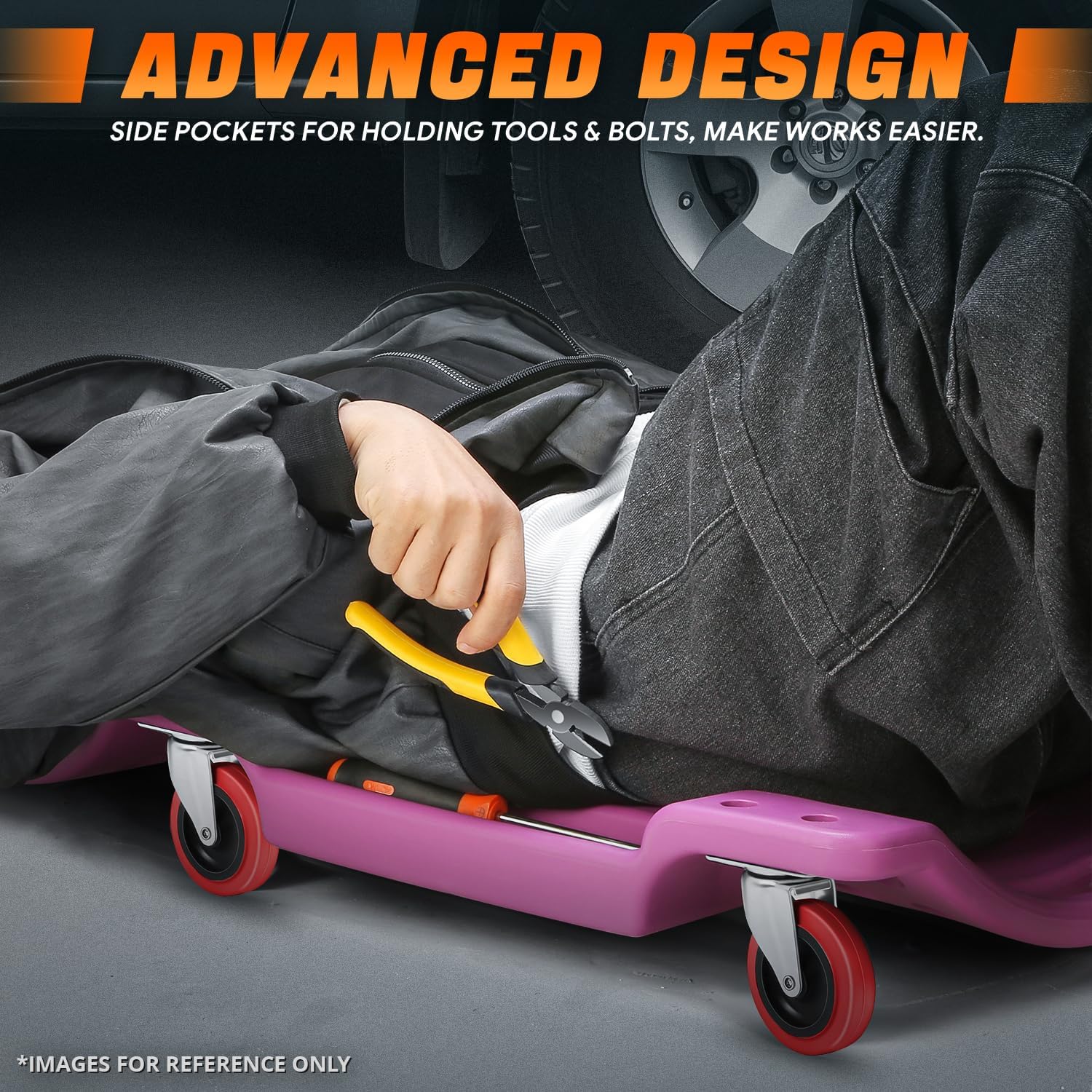 - 200 Lbs Max Load Capacity with Padded Headrest, fits for most users. Socket Tool Included for Easy Assembly; Side Pockets for Holding Tools & Bolts