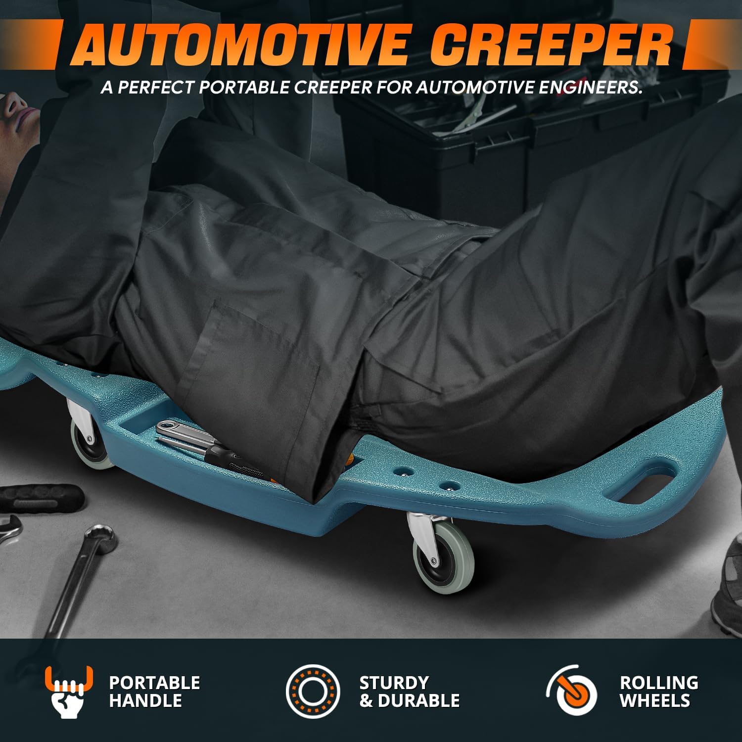 - PORTABLE AUTOMOTIVE CREEPER: A perfect portable creeper for the automotive engineers. It features built-in carry handles and caster wheels for easy mobility. The lightweight construction makes it easy to carry. It comes with socket tool for easy assembly.