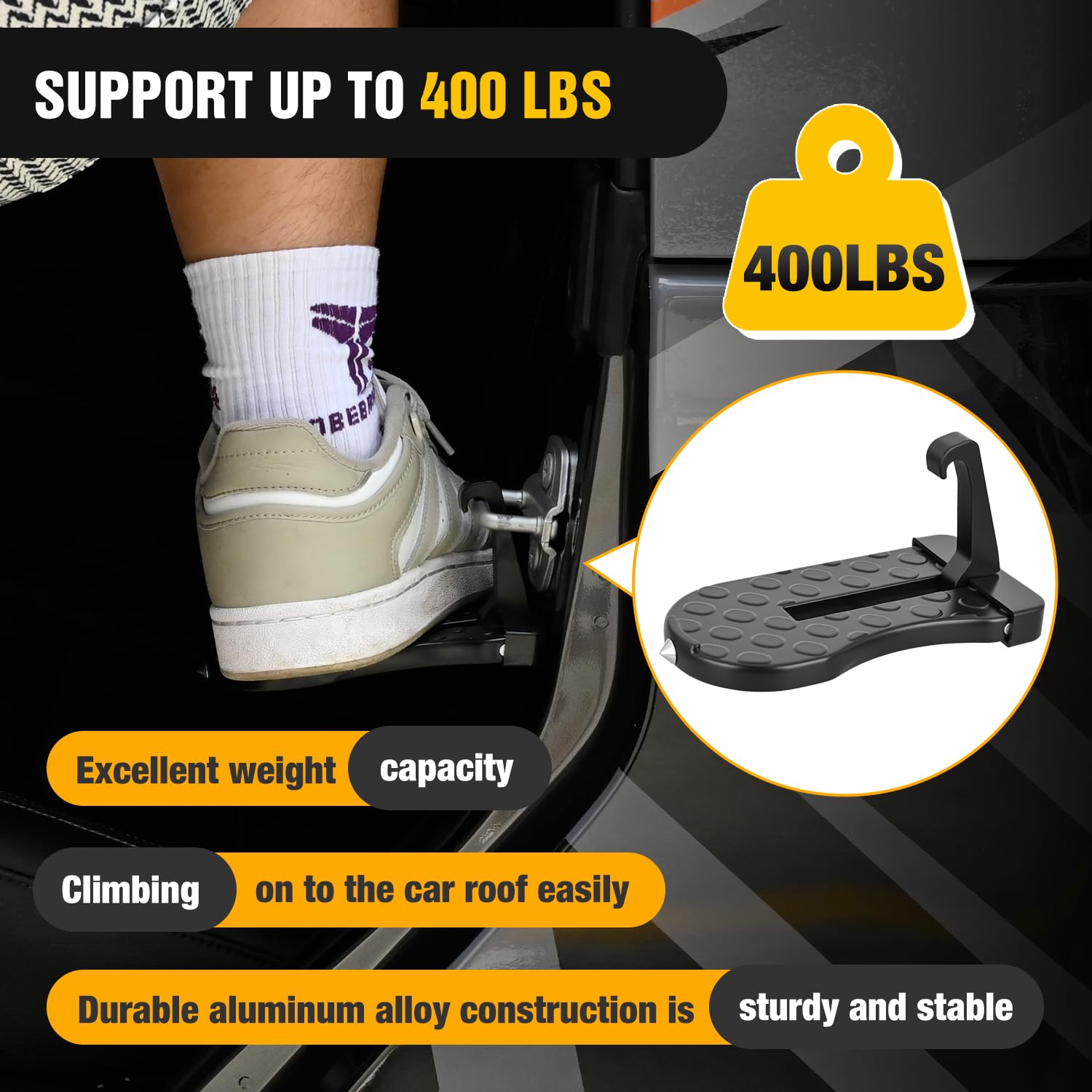 - STURDY & DURABLE: This car door latch step is made of high-quality aluminum alloy which is light and sturdy, exceptional strength and longevity. the maximum load capacity can reach 400lbs, it provides reliable support for various tasks. this folding door step is a must-have accessory for easy rooftop access. make your outdoor more convenient and enjoyable