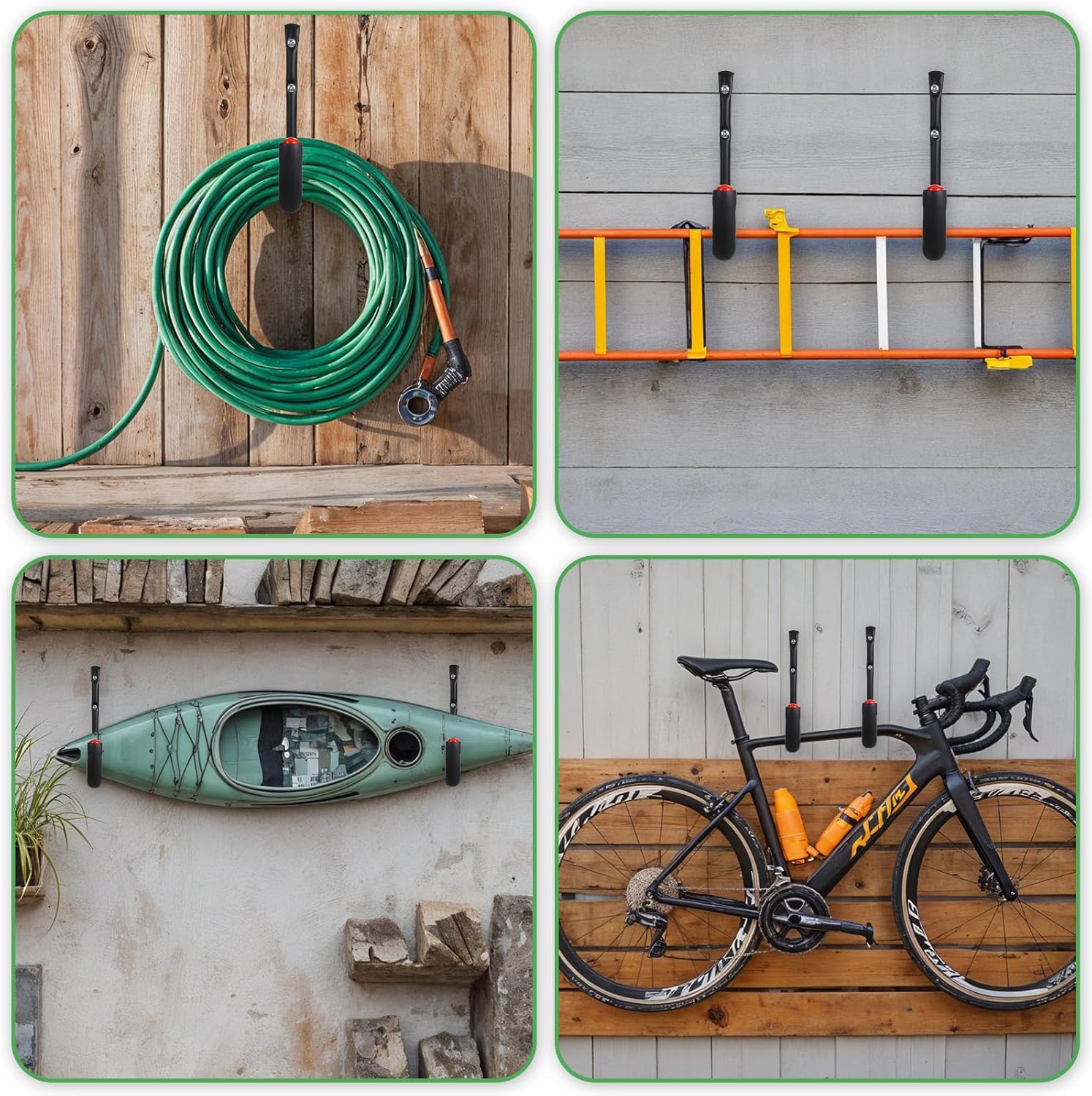 - 【Versatile Storage Solution】 Ideal as a kayak storage rack, bike hanger, ladder holder, or for organizing chairs, garden tools, or sports equipment. These black garage storage hooks maximize vertical space in garages, sheds, utility rooms, or basements, reducing clutter and protecting items from floor damage