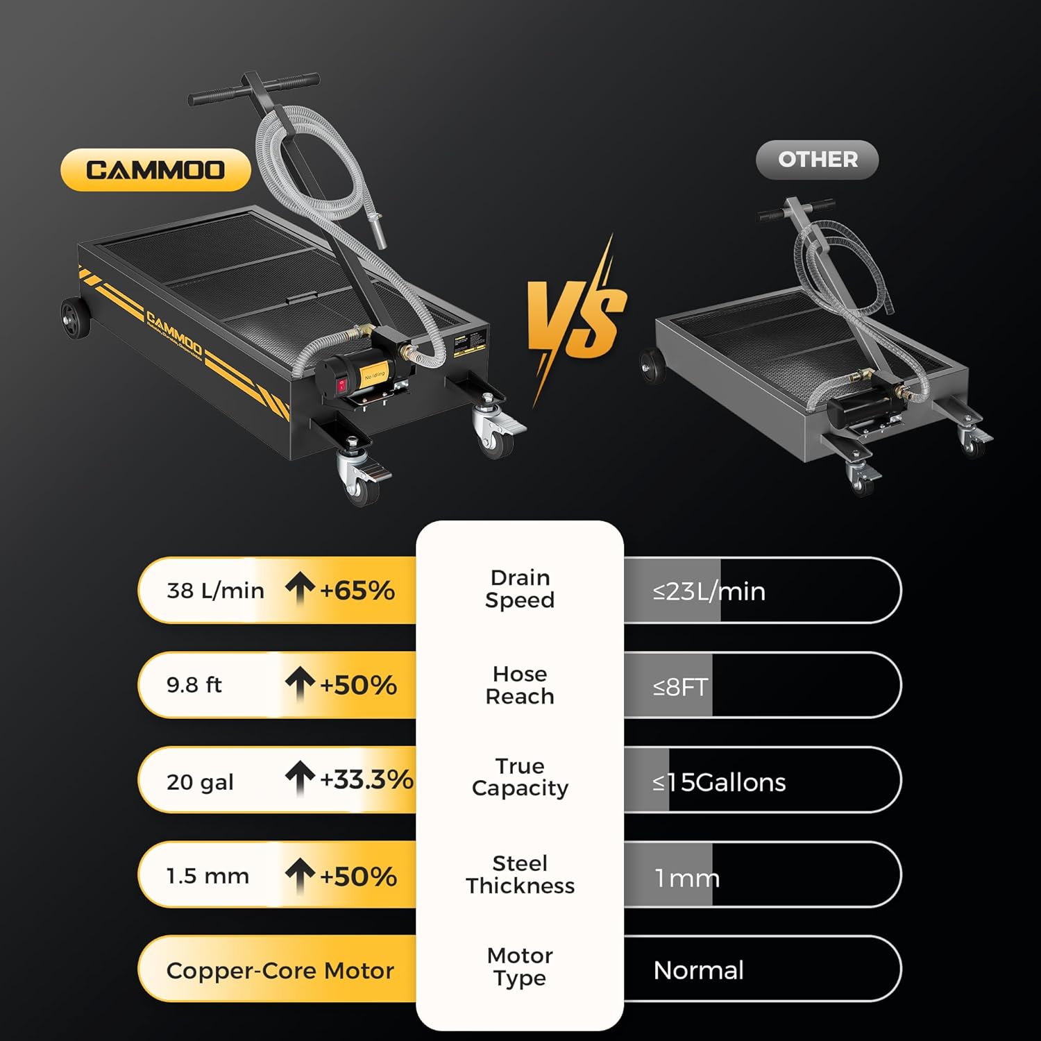 - Optimized Copper Motor:The copper motor features a 110V power supply and 200W maximum output, tipping the scales at 610.5g to stand heavier and more robust than standard motors in oil pans. This added heft translates to stronger performance: it delivers a powerful 38L/min flow rate, draining oil 65% faster to help finish jobs in less time. For busy shops, and weekend DIYers alike, this means boosted efficiency, reduced labor time, and smoother workflow—whether tackling back-to-back oil changes with oil pans or squeezing in a project at home. It is engineered to make every task quicker, easier, and more reliable.